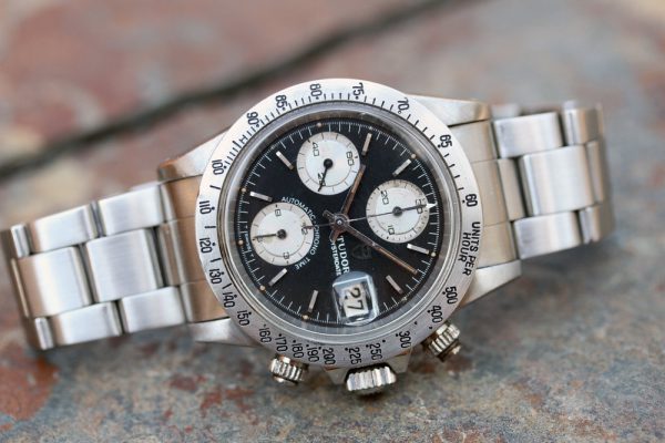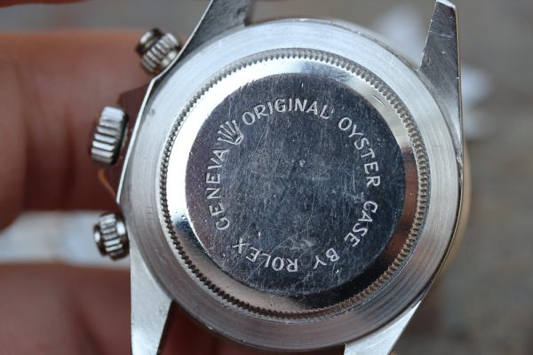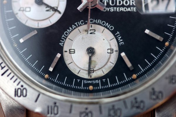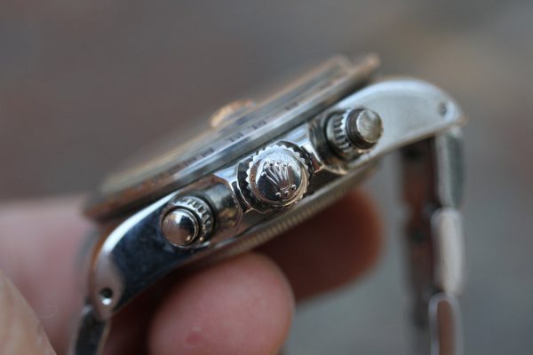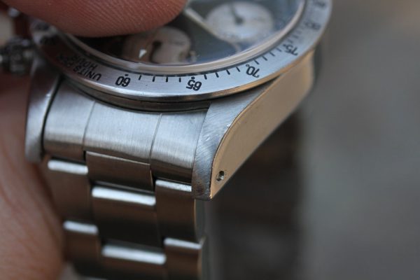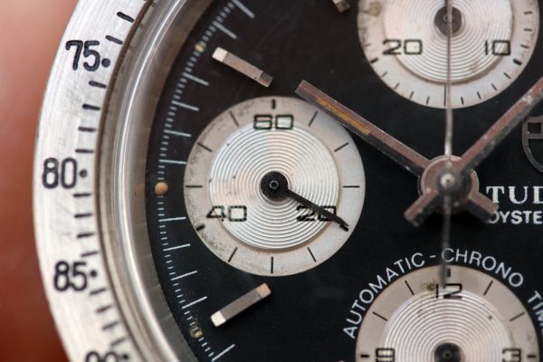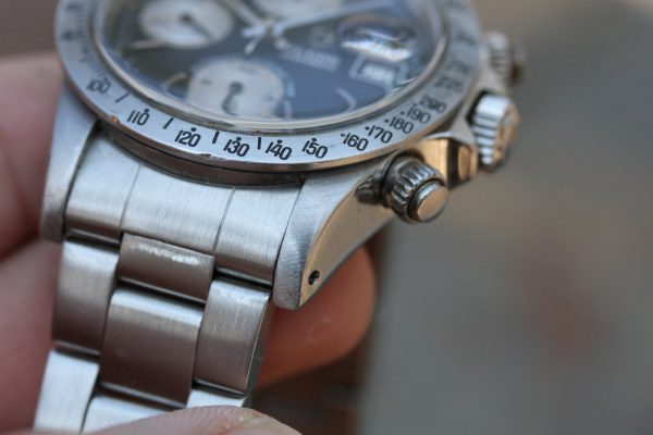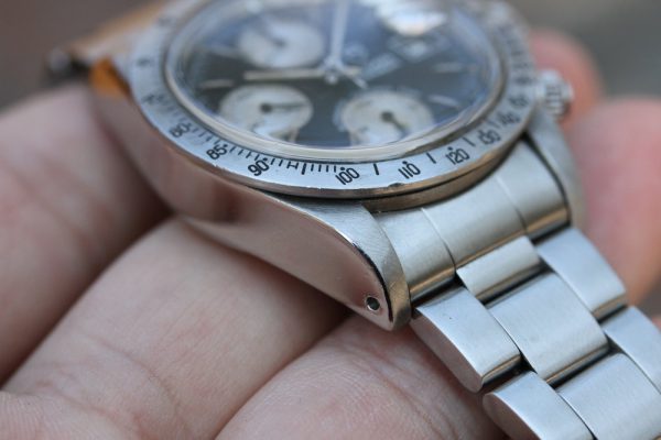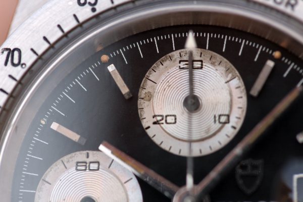 Dial is original, black with silver subs. Nice orange patina. The subdials are “dirty” and could possibly be cleaned off, but the watch is offered as found and price reflects it.