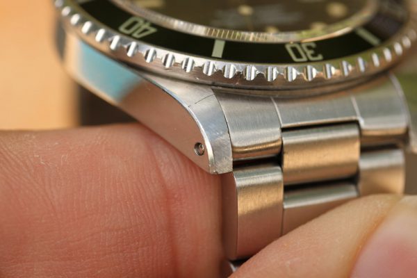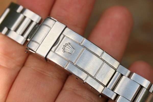Bracelet is original 93150 with 10 links, diver’s extension, 593 ends, very tight and unpolished clasp. Correct J date code.