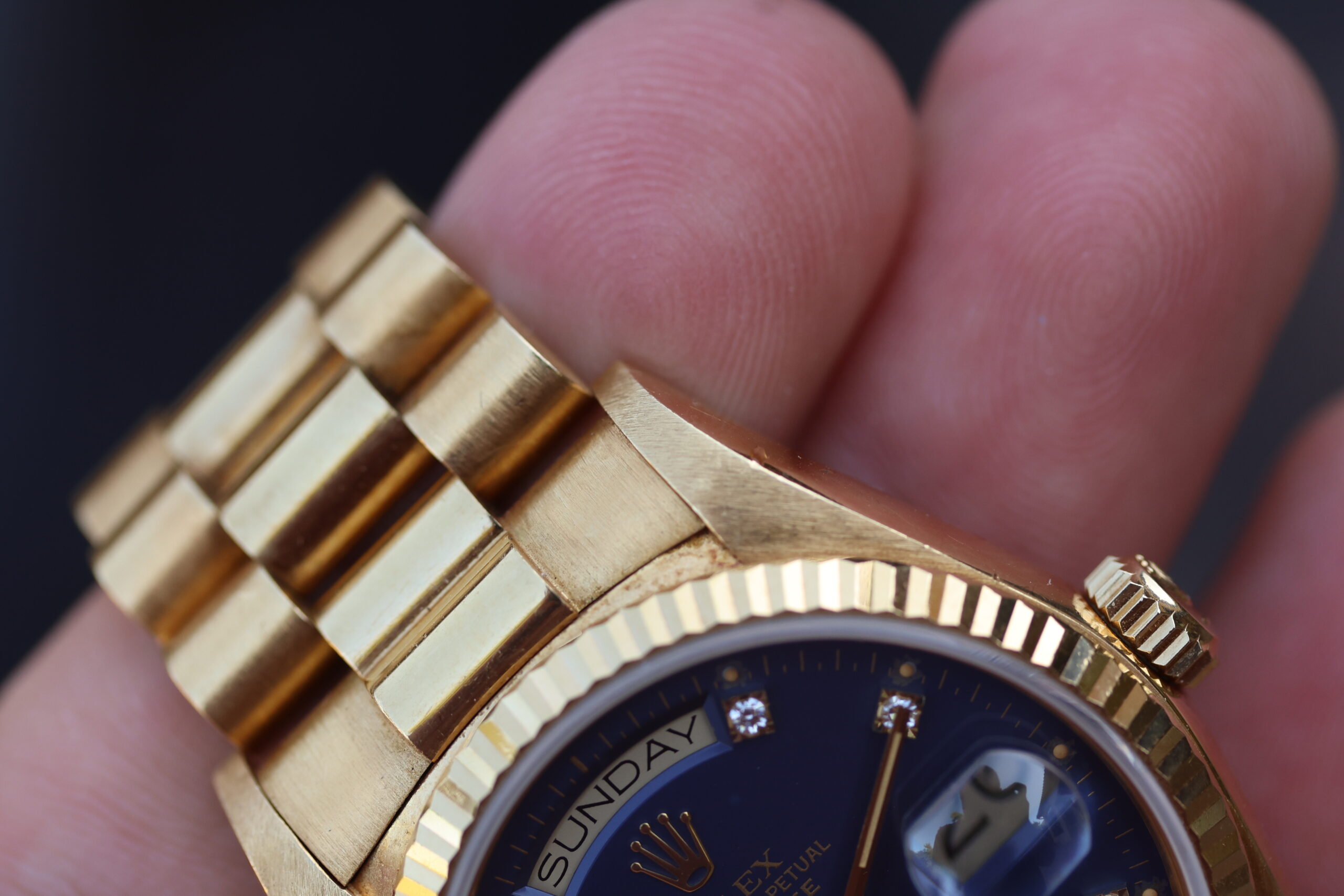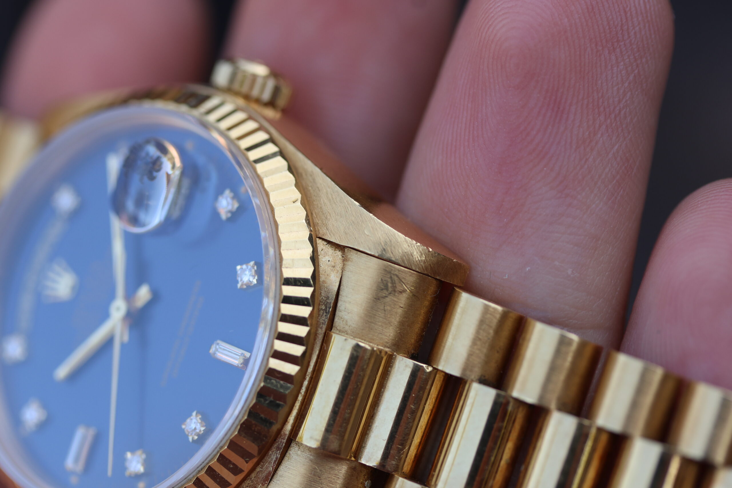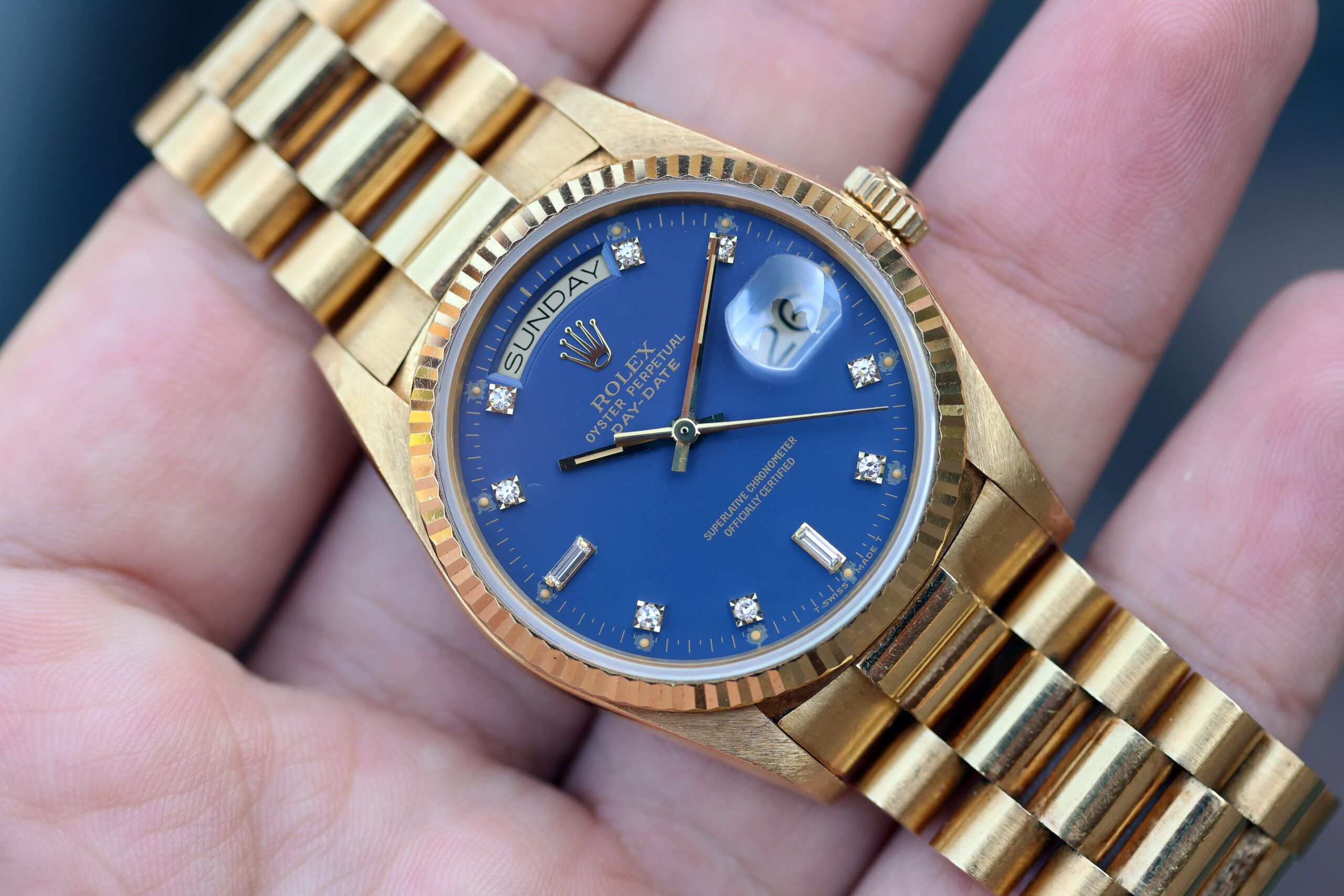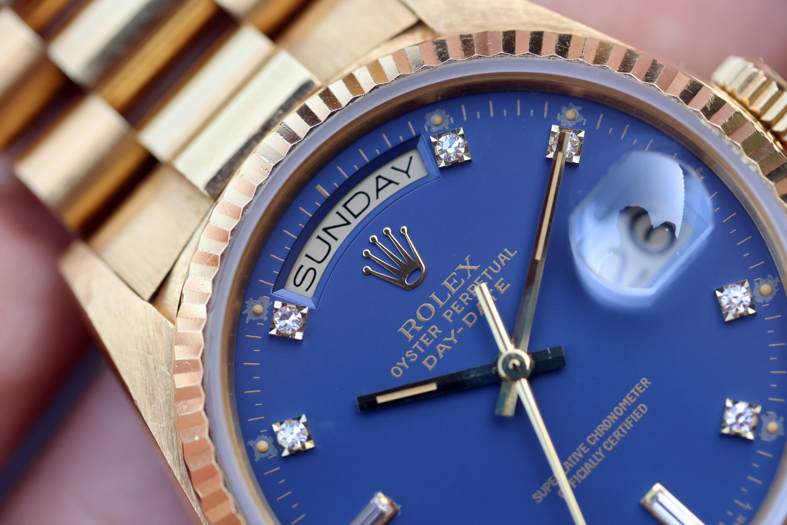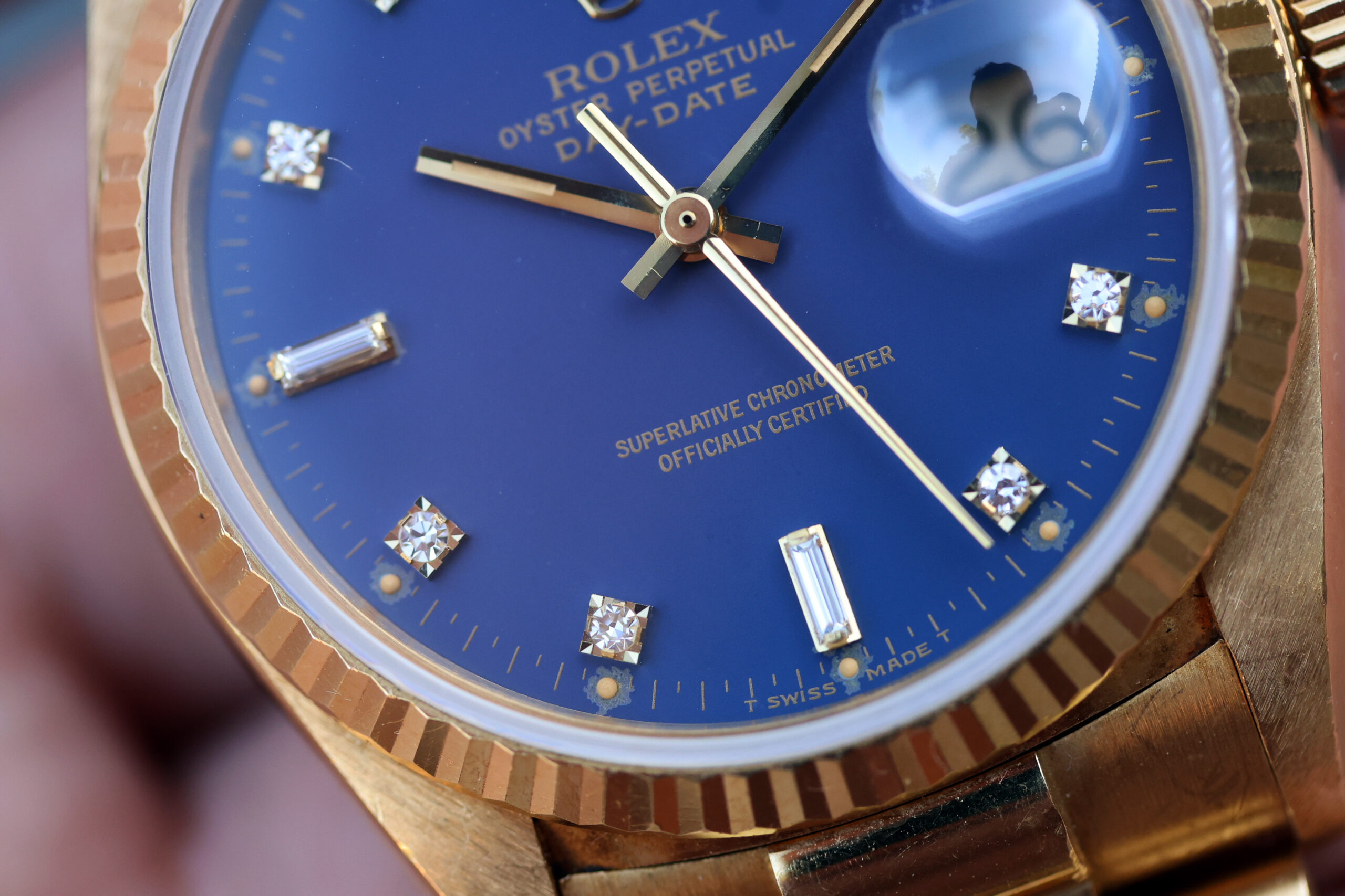 Dial is original, matte flat “cobalt blue” with a purple hue to it. Factory set diamonds. Original hands. Original English day disk and original open 6’s and 9’s date disk.