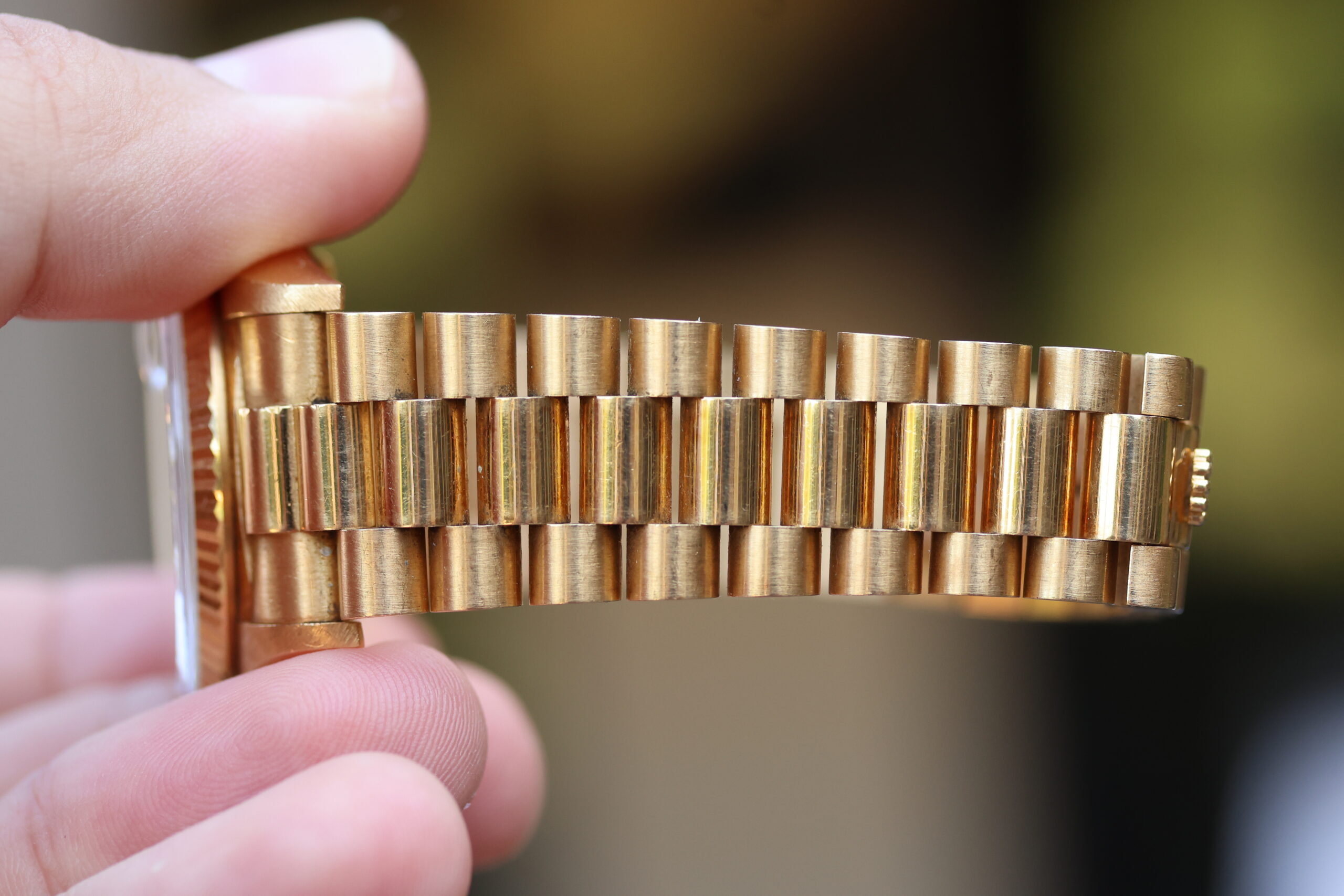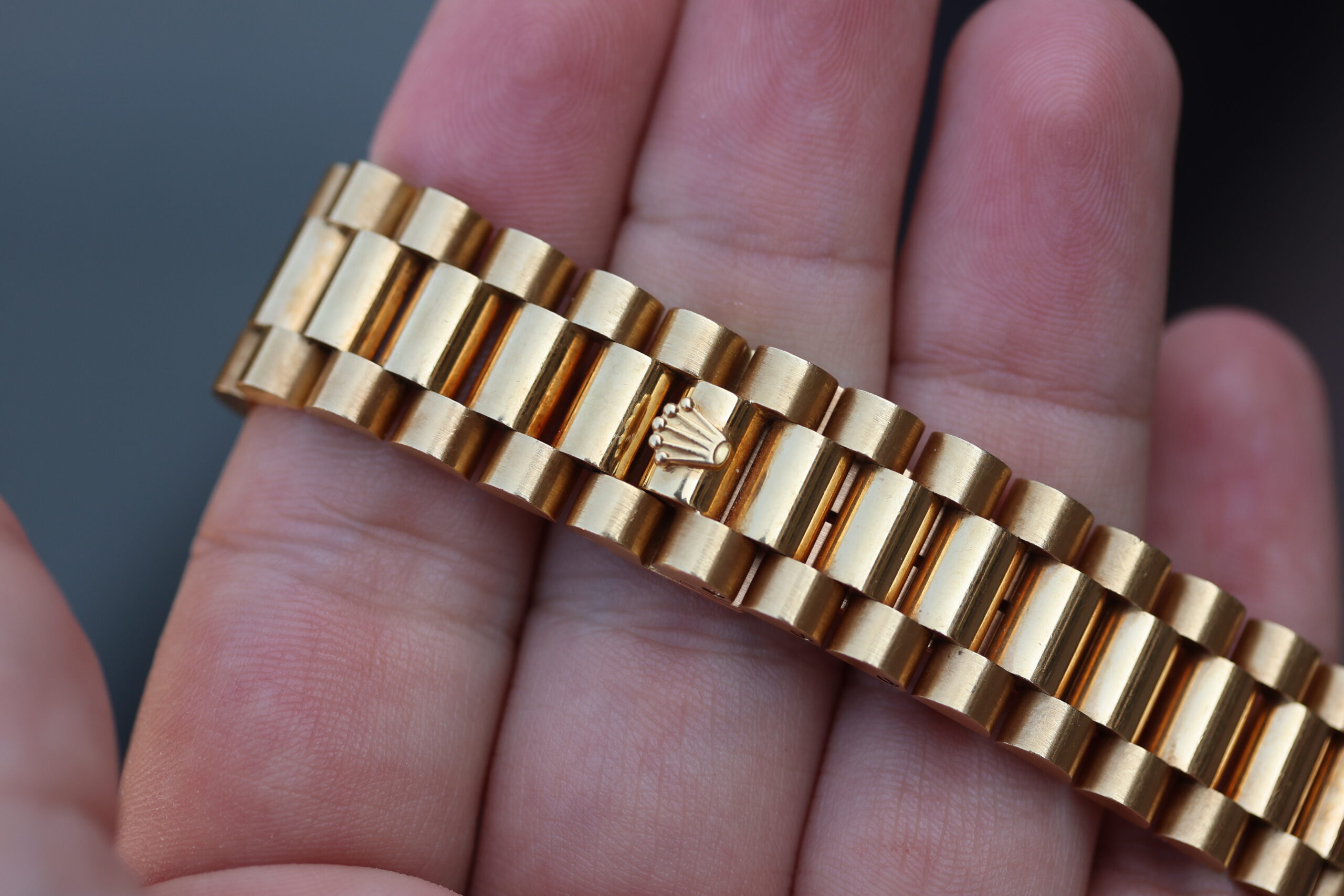 Tight and original President bracelet fits a normal sized wrist. Missing only 1 link from factory length. Correct K date code and “55” end-links.