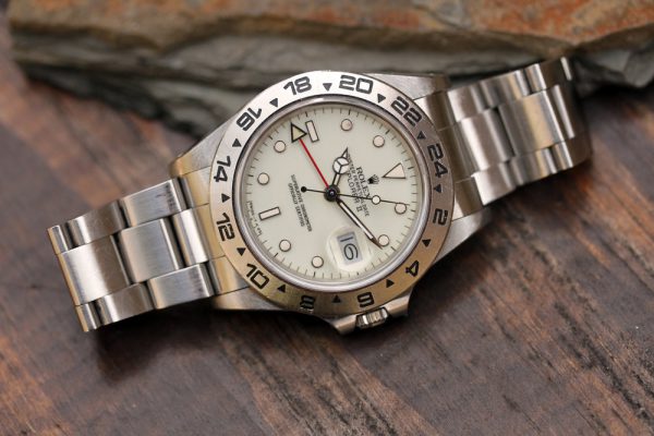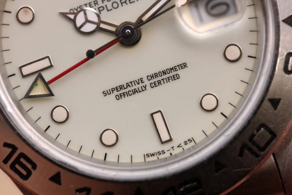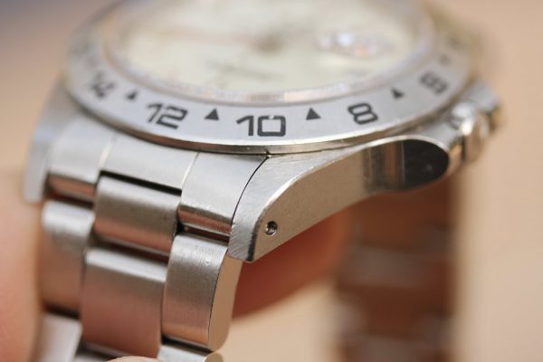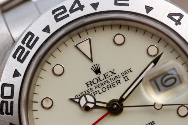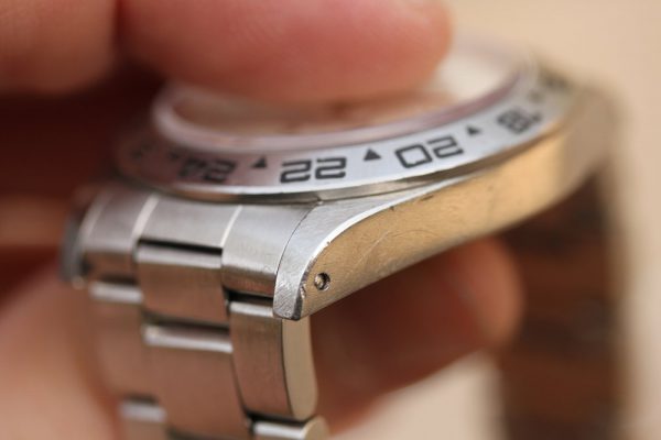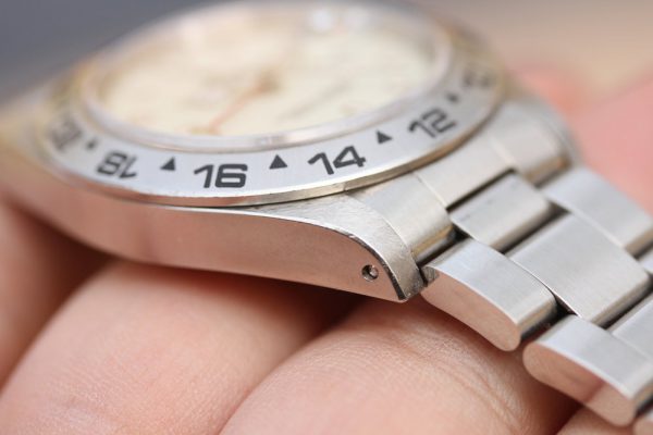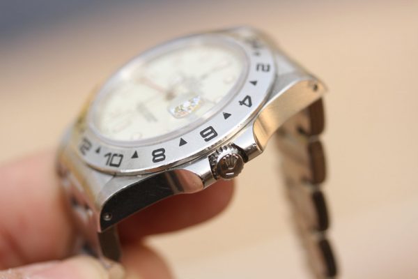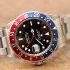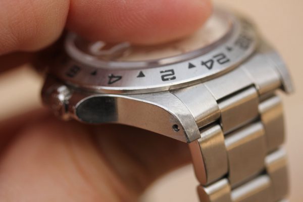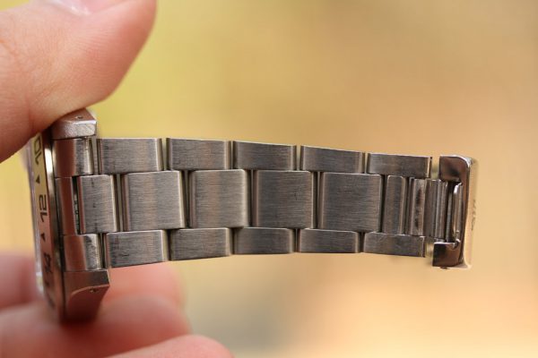 Excellent and original “cream” dial with Rail print. Nice creamy patina on plots and good cream color on dial itself. The hands are original and tritium. There was some oxidation on GMT hand, so the patina is dark. The other hands retain white color. In this case it nicely shows the contract between white and actual color of the dial. I recommend getting the hands color matched by someone like LA Watchworks, but the watch is presented and sold as found. Original date disk with open 6’s and 9’s.
