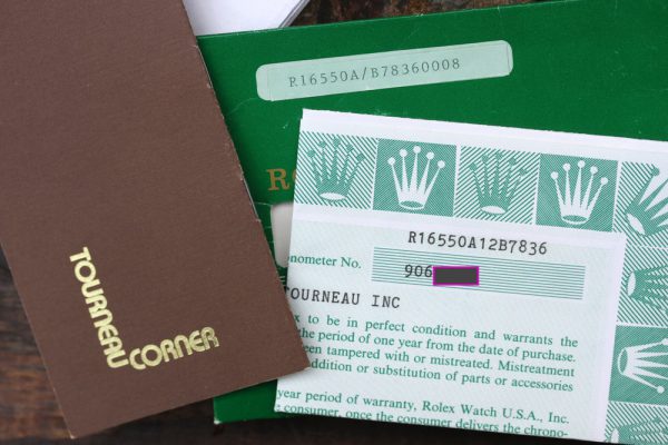 Watch comes complete with Rolex boxes, sleeve, hang tags, warranty papers from Tourneau, even copy of sales receipt when purchased new.