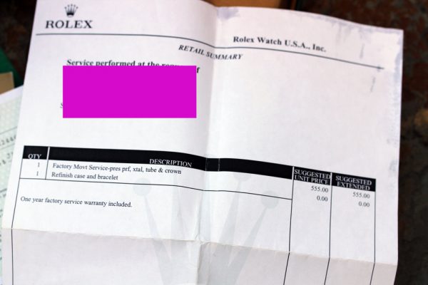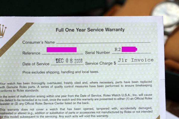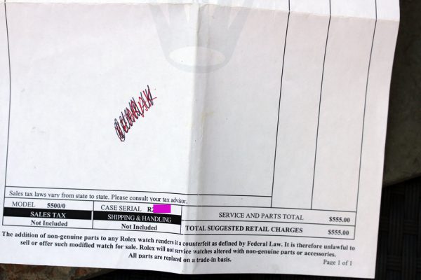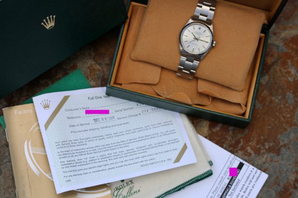 Watch comes with Rolex boxes, service manual, RSC service warranty from 2008 and RSC service receipt indicating full overhaul performed.