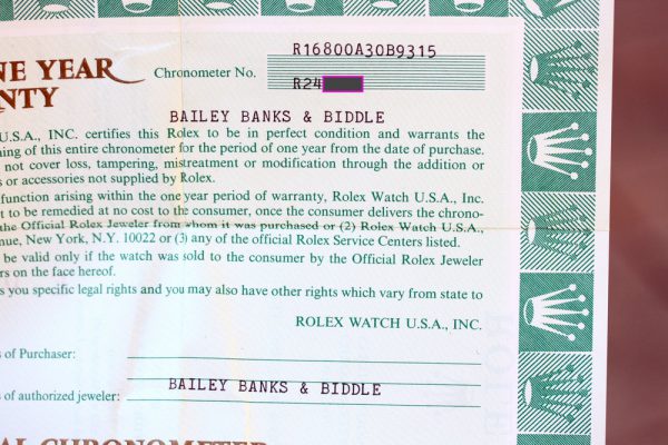 Watch comes complete with Rolex boxes, manual, warranty paper, both matching hang tags, and box sticker.