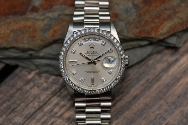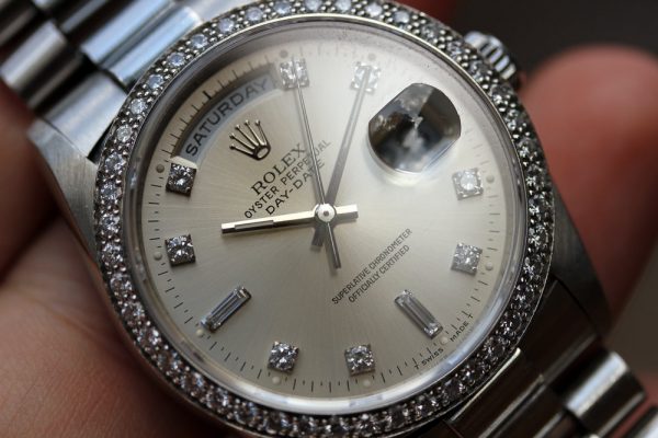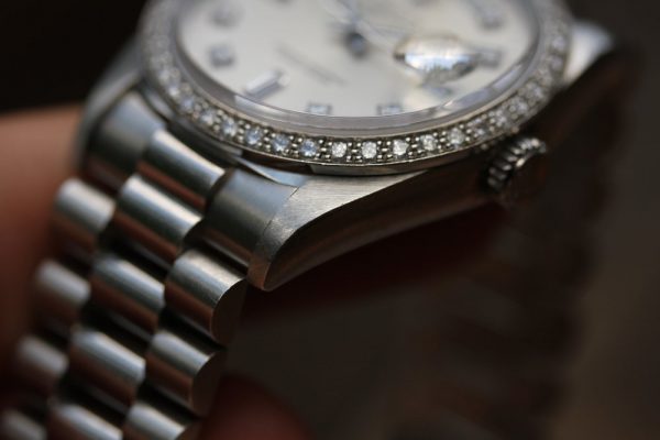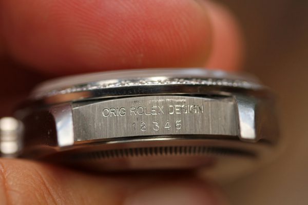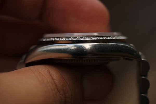 Bezel is original, factory Rolex set with diamonds, in excellent condition.