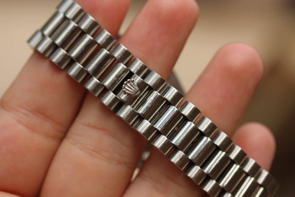 Bracelet is original Rolex President in platinum, correct 55B ends, tight condition, missing 2 links from factory, fits a normal wrist.
