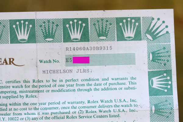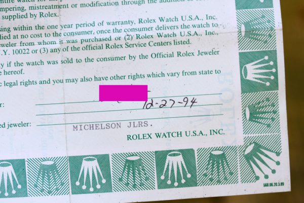 Watch comes very complete with Rolex boxes, manuals, warranty papers and matching hang tag. The papers are dated in 1994 at the time of purchase. The watch also comes with its original typed sale receipt from AD with matching numbers to the watch.