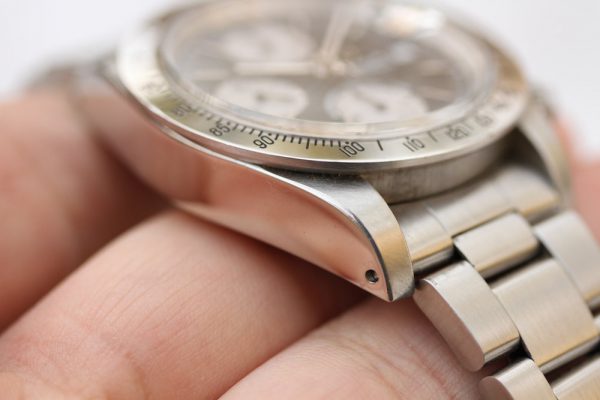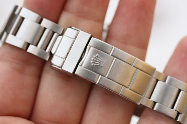The bracelet on this watch is a Rolex 93150 and 580 ends. It is techincally incorrect for the watch as the papers state that it should have come on 78360 bracelet. If you look at the pictures with serial and reference numbers, you can see the end-links “wear” is from these end-links and not 2 separate sets of them, as the 78360 would original come with 589 end-links, which are taller to cover the thick case of the watch. So, my theory is that the buyer wanted a flip-lock bracelet instead of the 78360 and the AD swapped it out for him at the store. The bracelet is tight, with similar degree of wear as the rest of the watch.