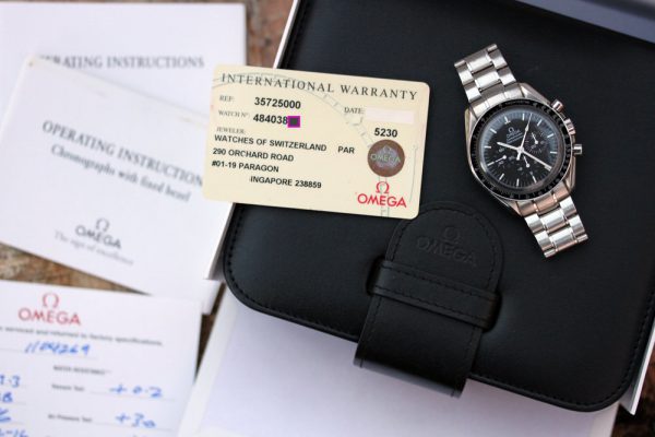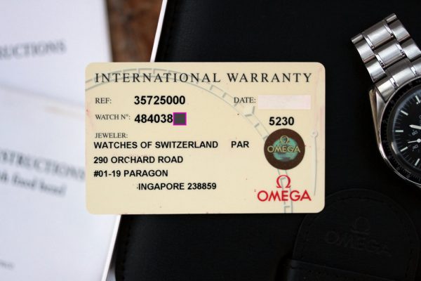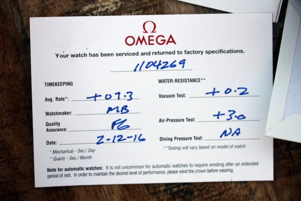 Watch comes as a complete set with Omega boxes, manuals, original warranty card, and also an Omega service receipt from 2016.