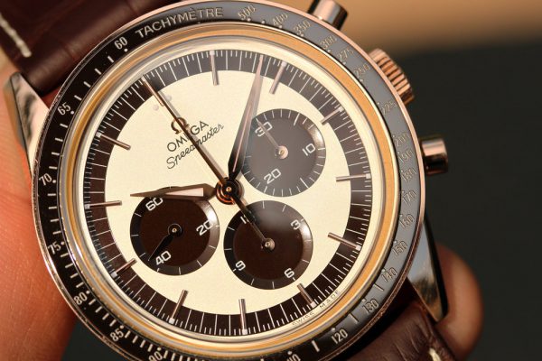 This watch features a brown bezel insert with cream and brown dial and rose gold hands and markers.