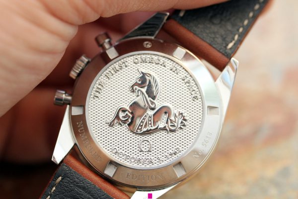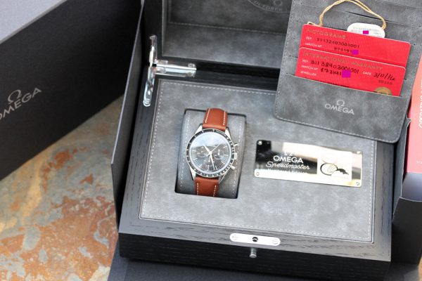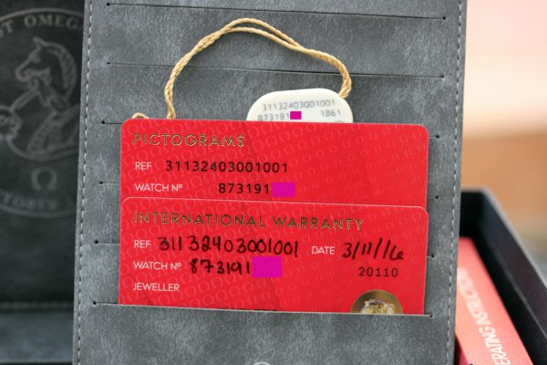 The watch comes complete with special Omega boxes, manual book, matching hang tag, and both cards.
