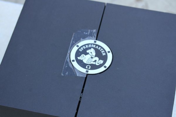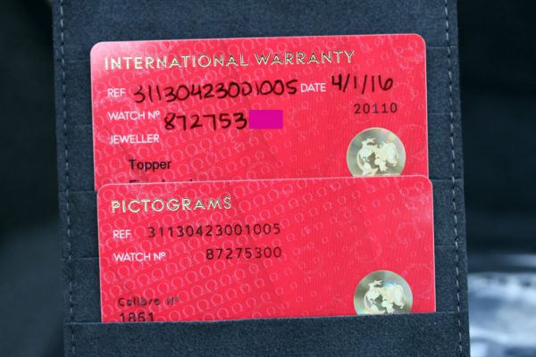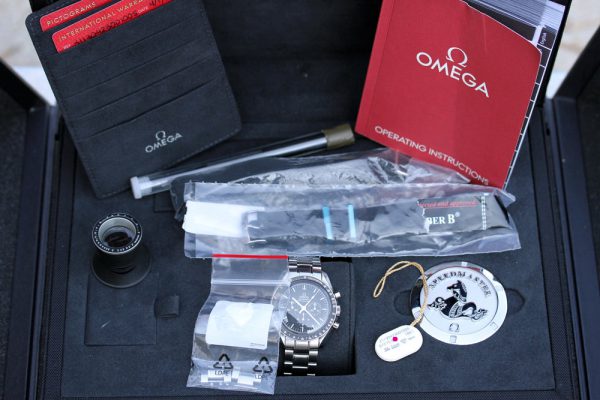 This watch comes with Omega boxes, manual, cards from US AD, hang tag, tools, 2 straps, medallion, loupe, etc. The outside of the cardboard box is damaged (the medallion came off and now secured with tape), and the box was partially taped with USPS packing tape.