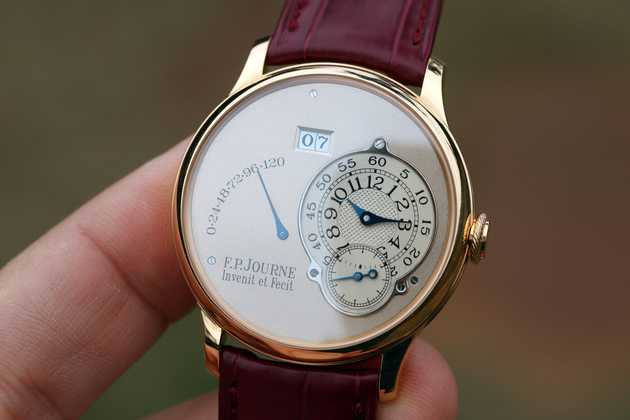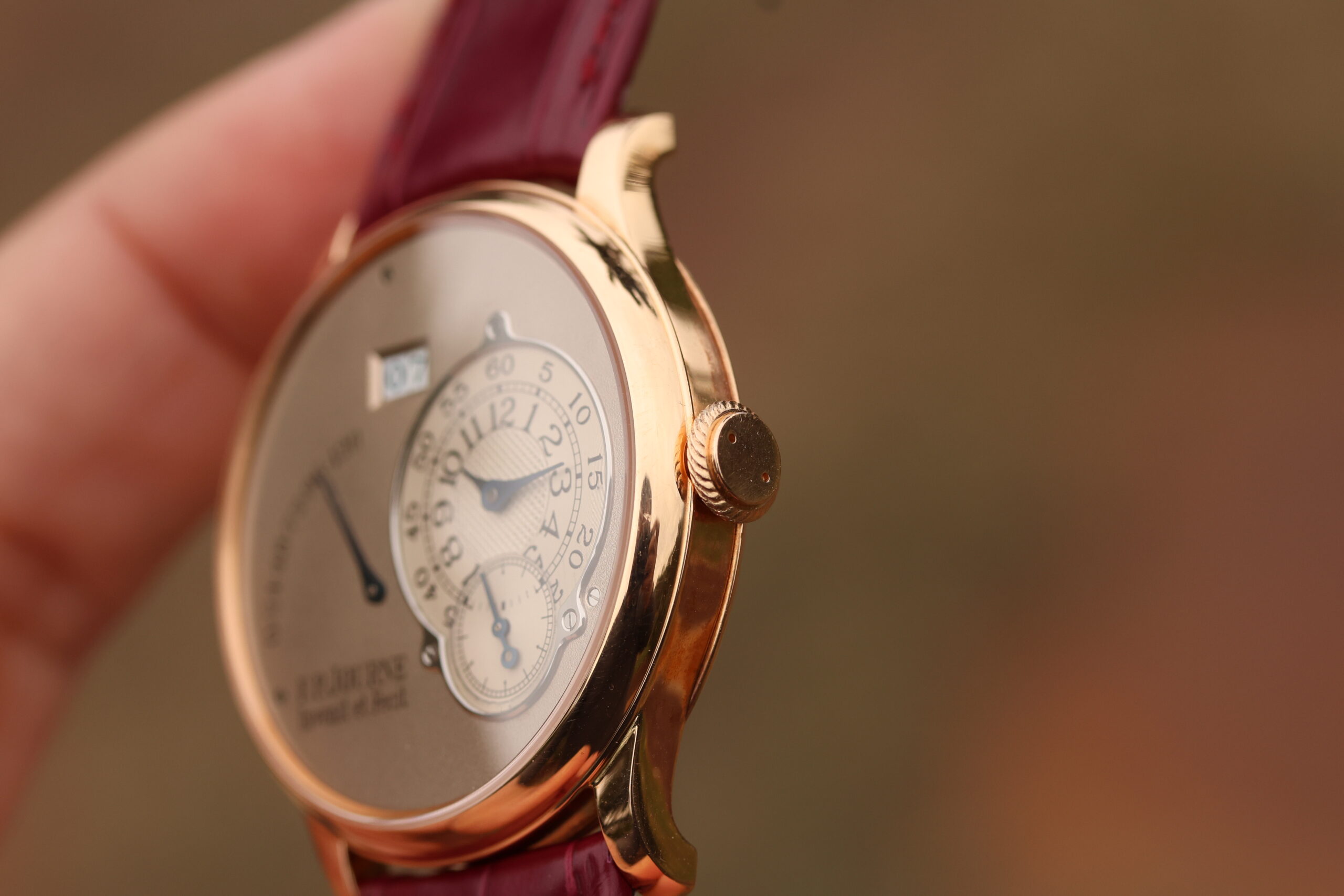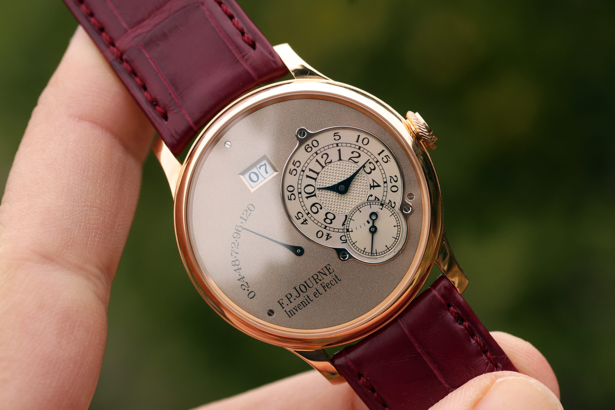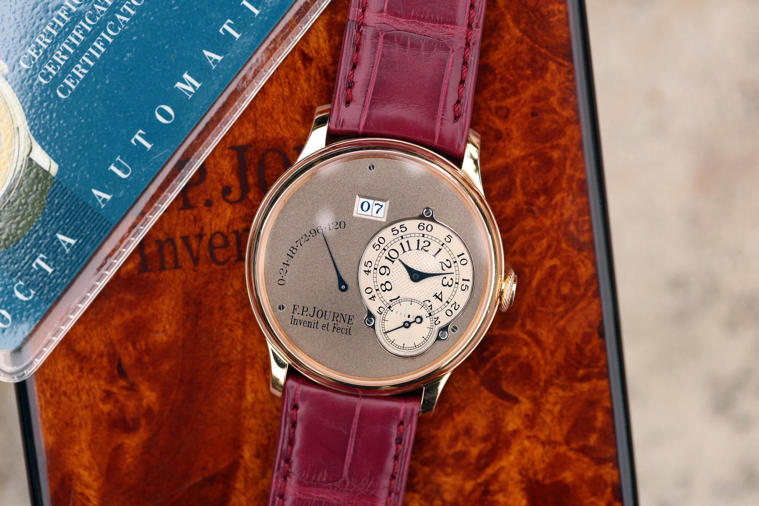 The watch is presented in the pictures on a FPJ burgundy strap in unworn condition. This strap will also be included.