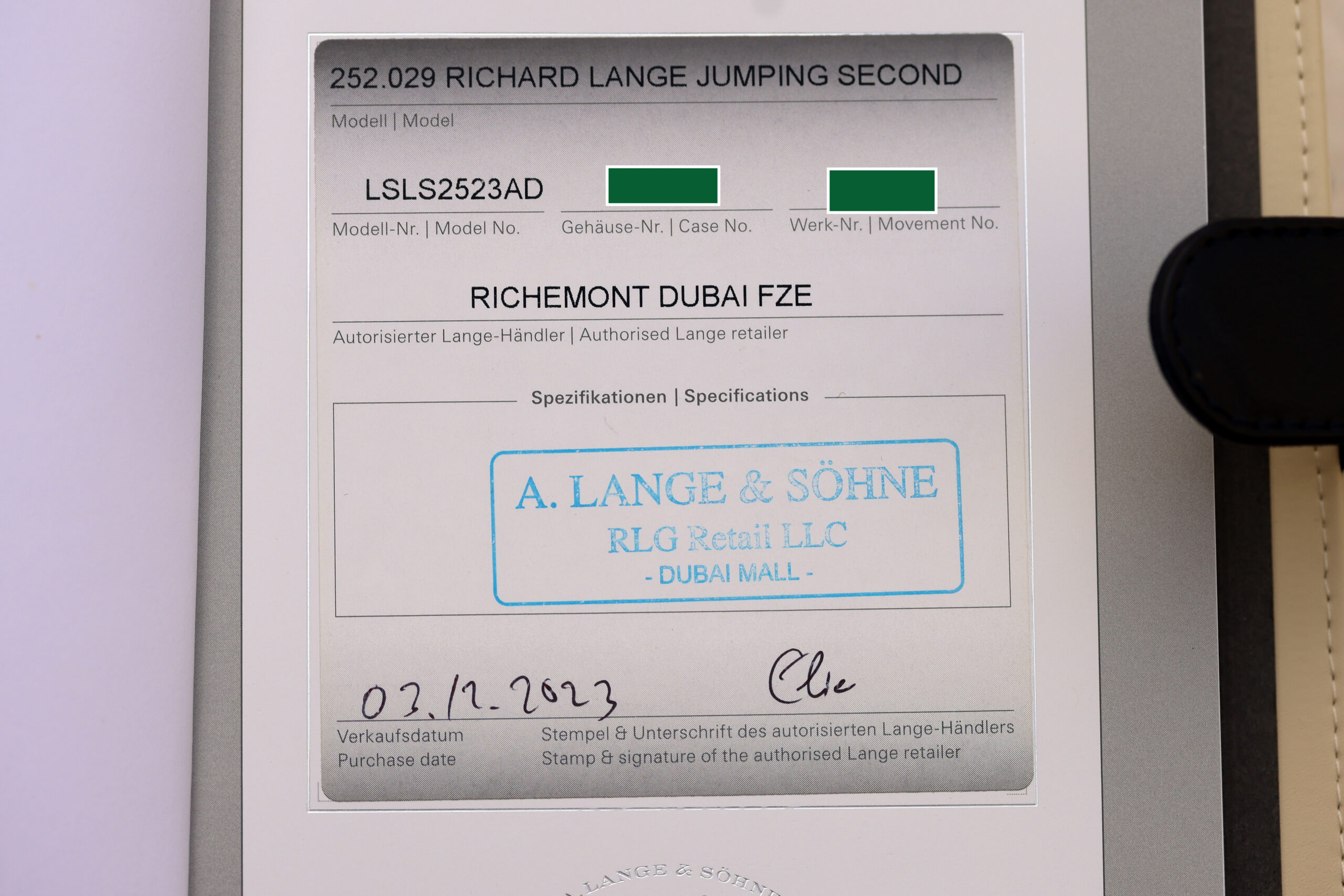 This watch comes complete with Lange boxes, manuals, and papers dated in 2023.