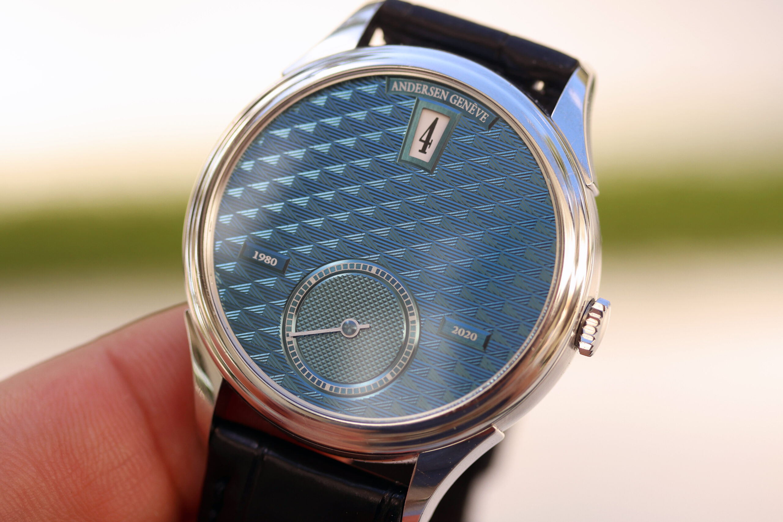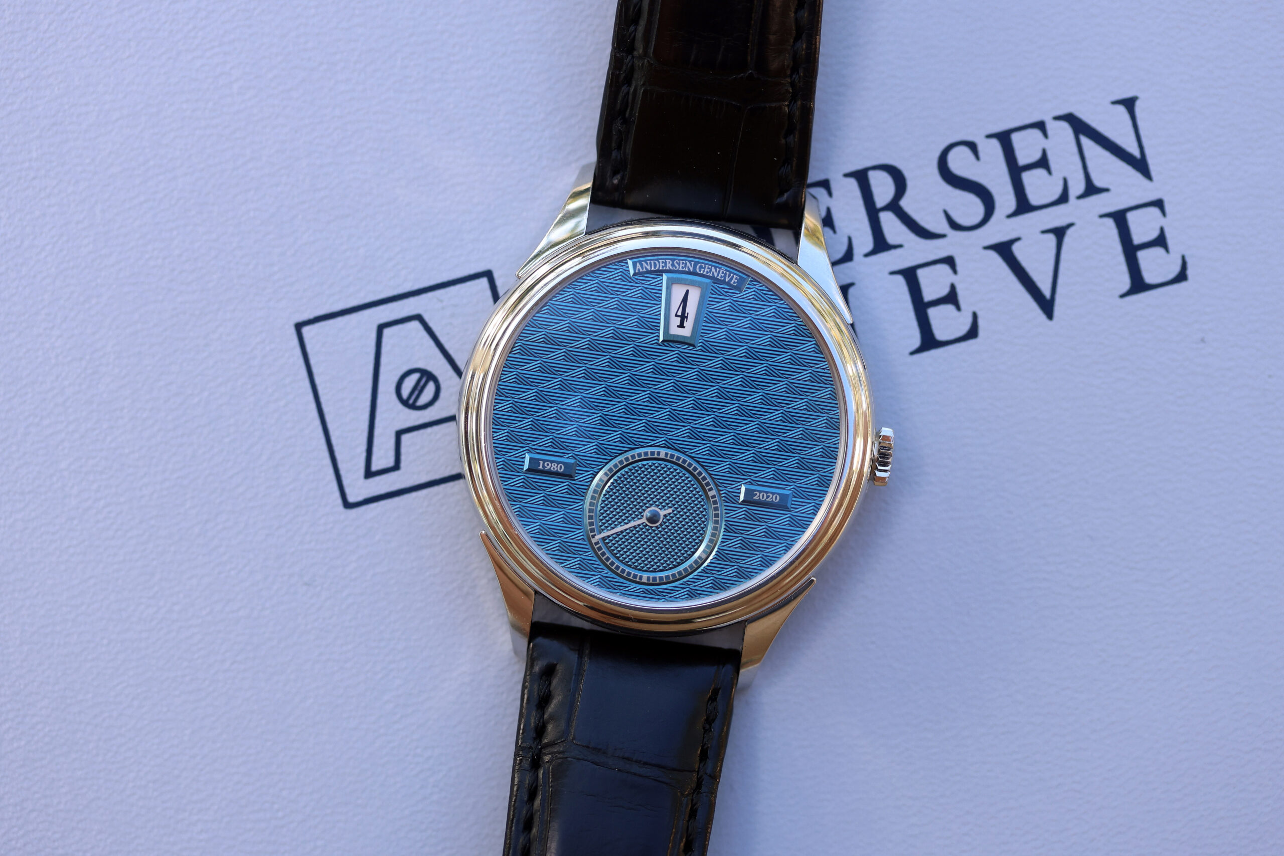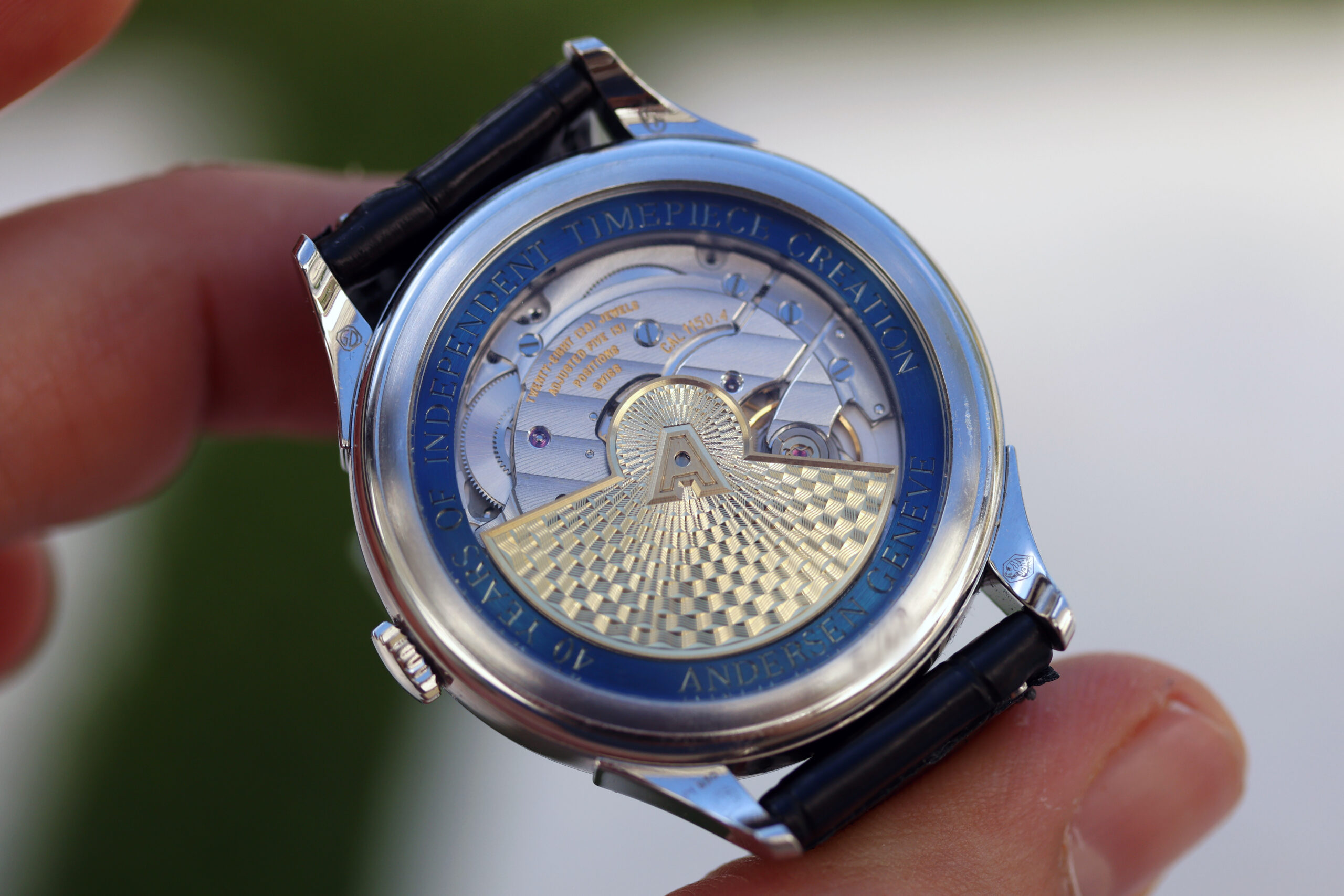 Through the sapphire caseback, the ultra-slim Frédéric Piguet 11.50 calibre is revealed, upgraded with ANDERSEN Genève’s in-house jumping hours module and a 60-hour power reserve via twin barrels. Hand-chamfered bridges display classic Geneva stripes, while the 18-carat yellow gold rotor features traditional grains d’orge guilloché and the signature ANDERSEN Genève “A” emblem. Surrounding the movement, a hand-engraved 21-carat BlueGold ring commemorates “40 years of independent timepiece creation”.
