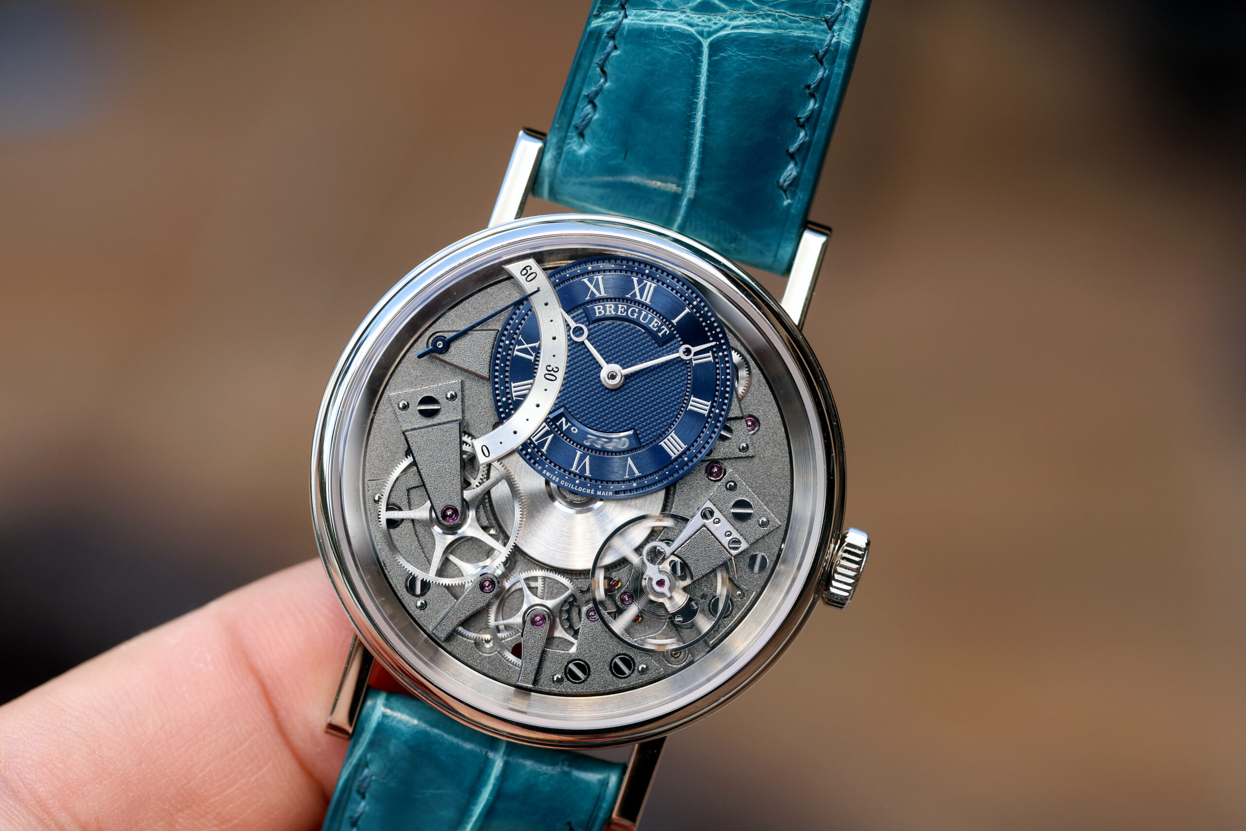 The watch was purchased new in 2021 and remains in excellent condition without any notable scratches, dings or dents. It comes on an aftermarket turquoise strap, but maintains its original white gold Breguet buckle.