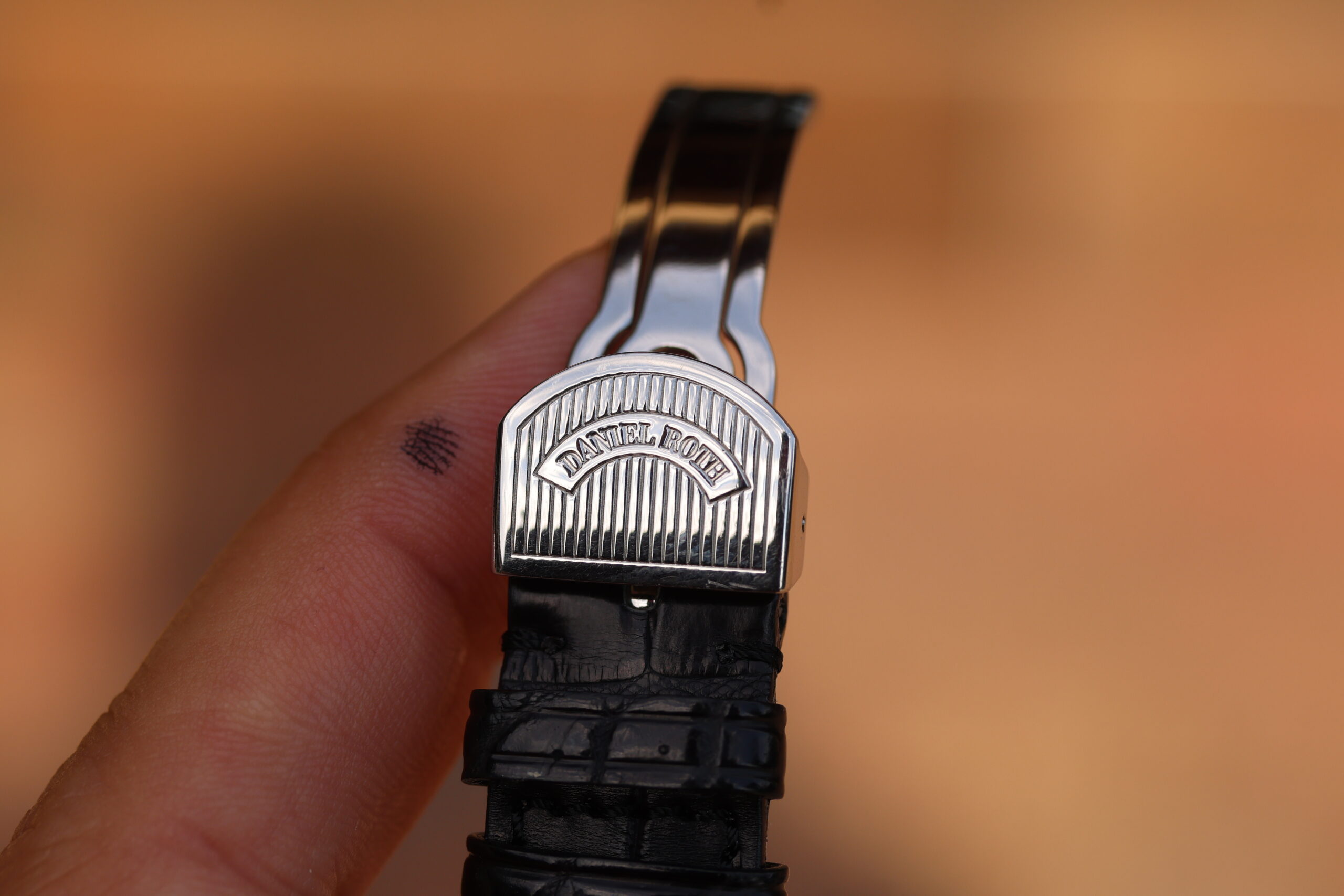 The watch on a black leather strap with original Daniel Roth deployment.