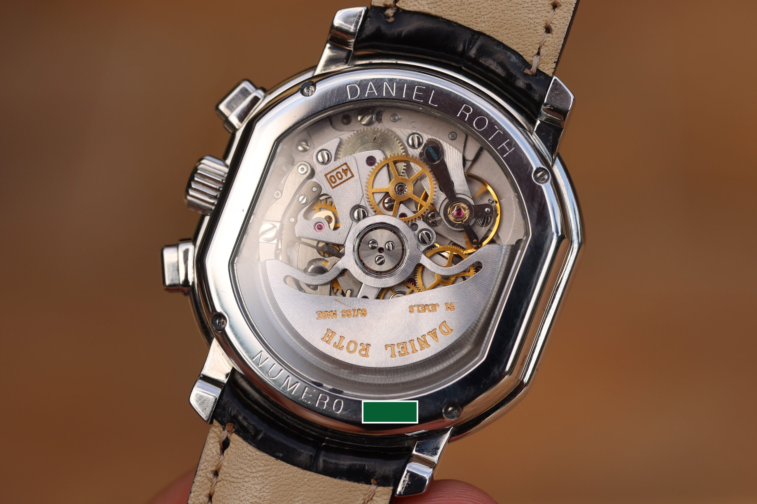 Turning the watch over, you can admire the beautiful Automatic Daniel Roth 400 movement, which is based on the El Primero and assembled by hand in the brand’s Vallée de Joux workshop, with an autonomy of 50 hours.