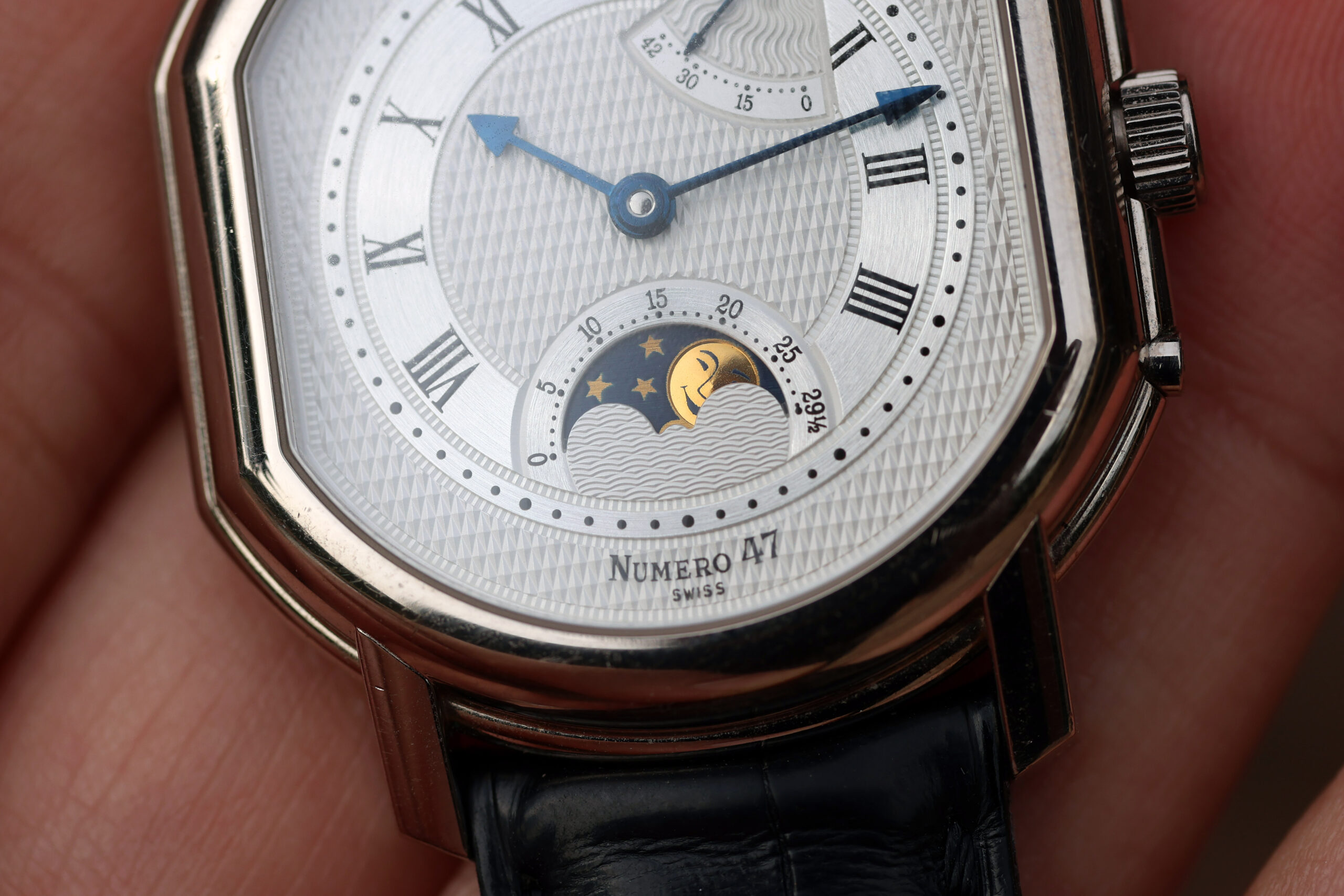 Very attractive dial with a combination of guilloche finishes and brushed sliver.