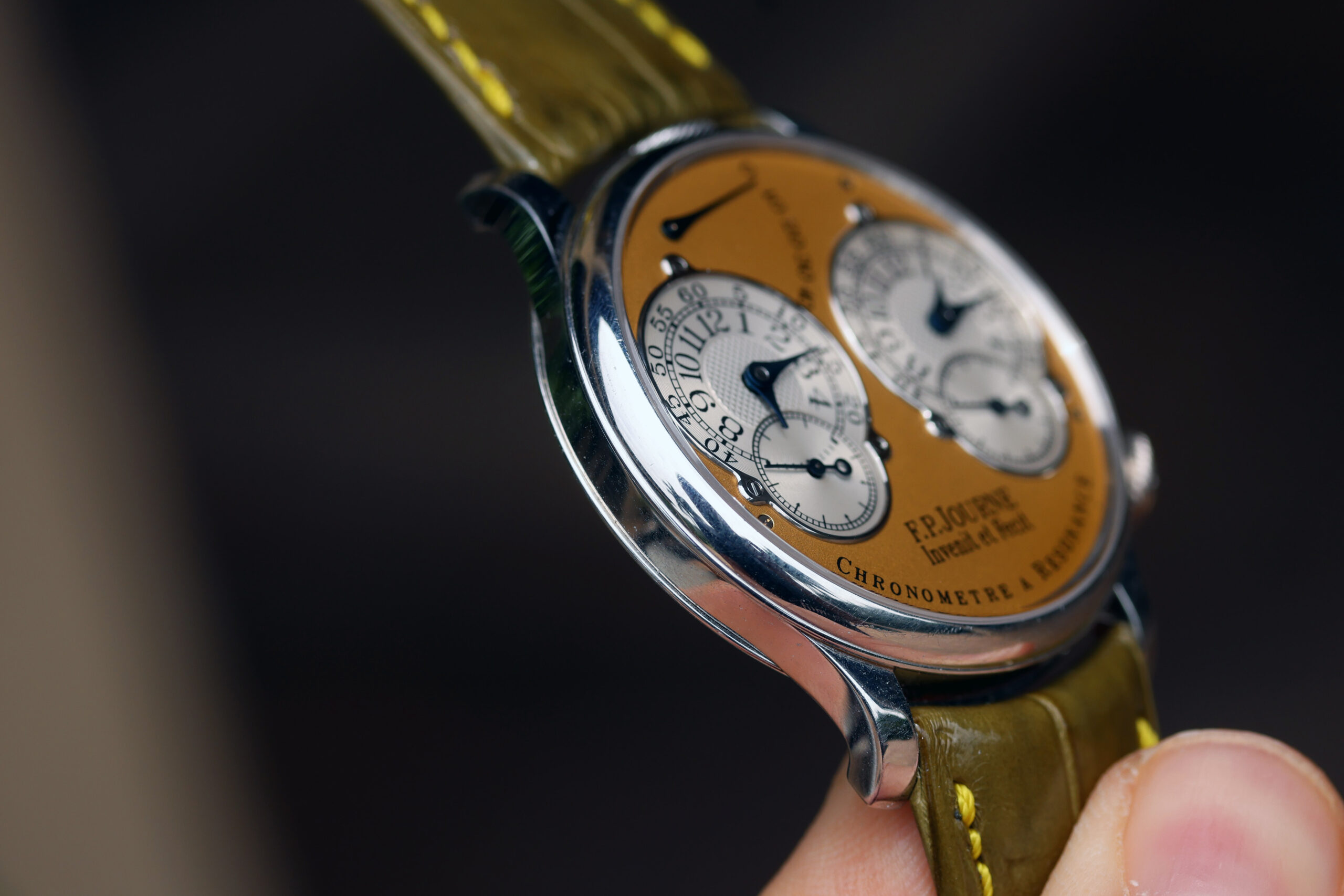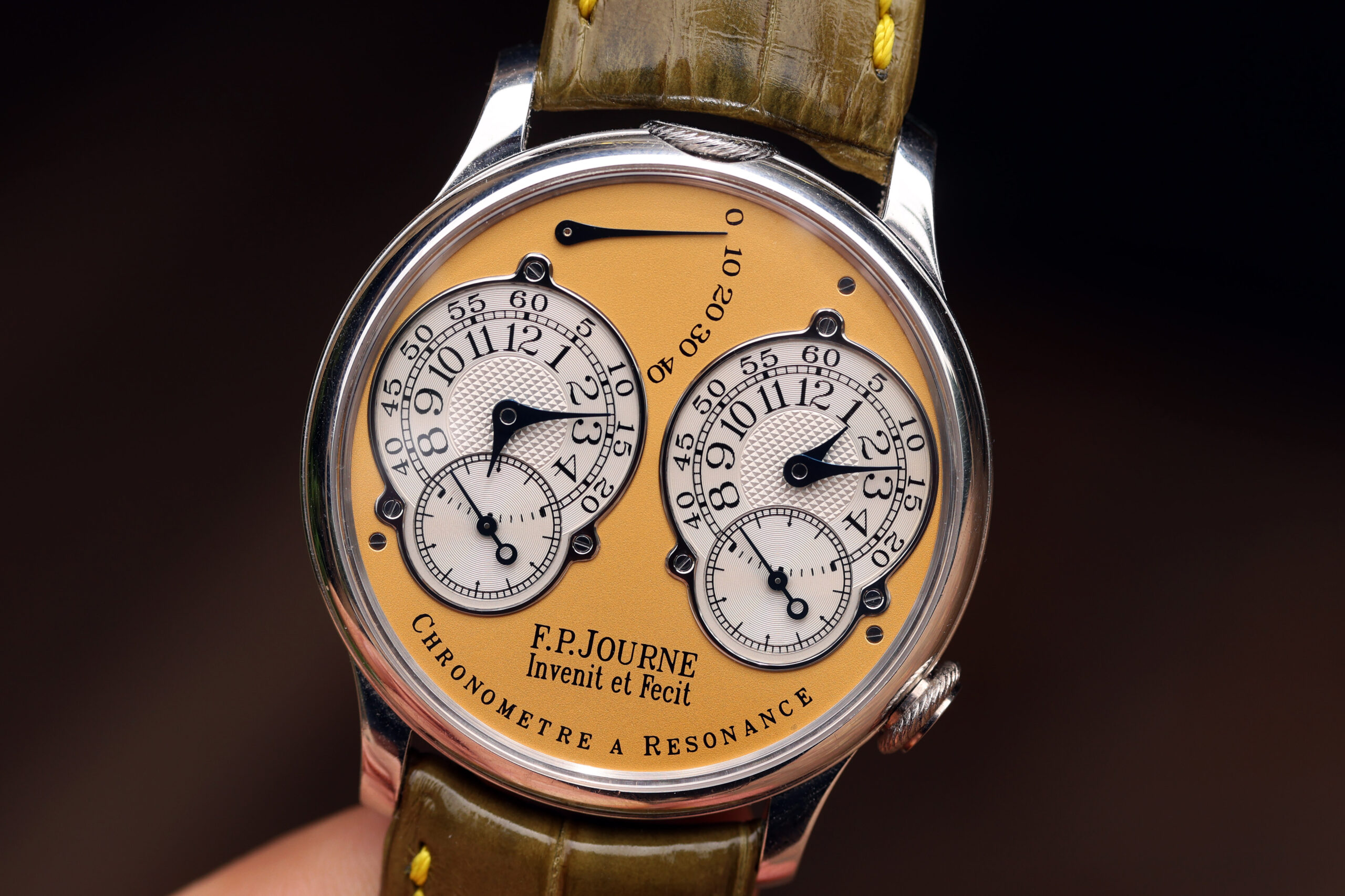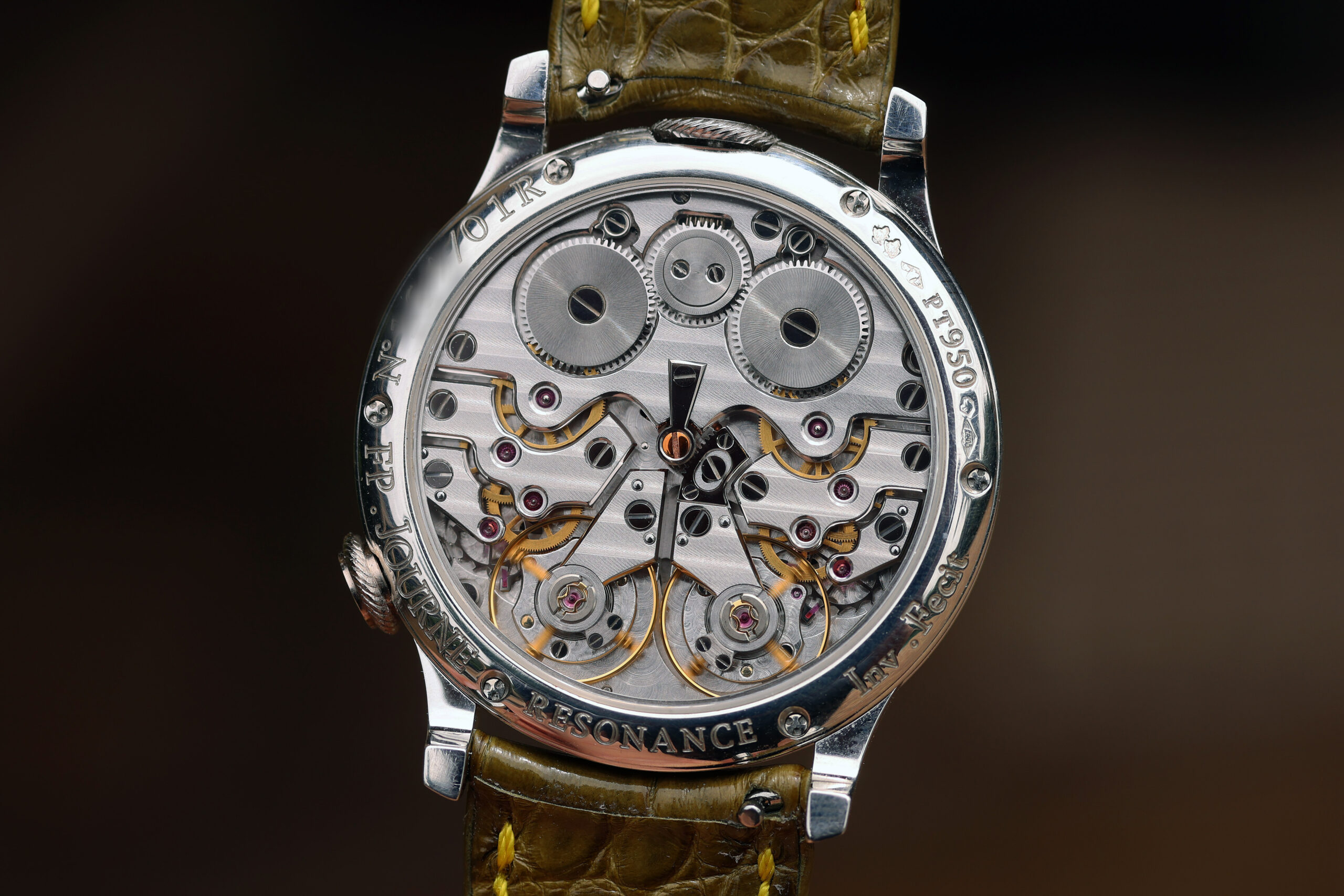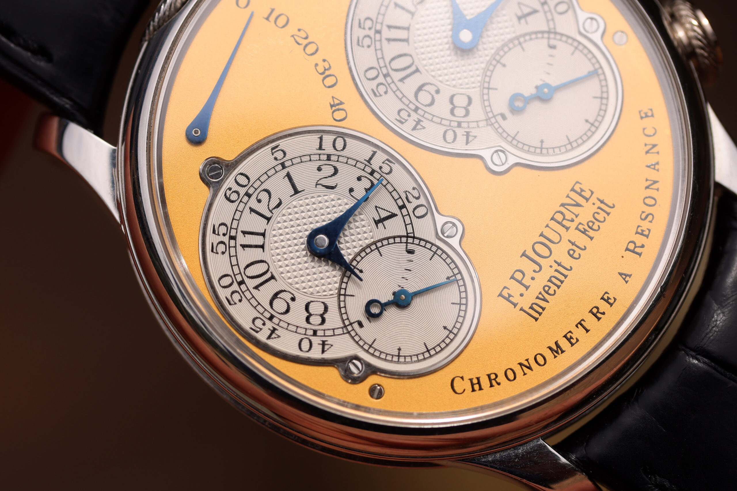 The platinum case with yellow gold dial spec on this watch is probably the most desirable. Yellow dials were only available on brass movement watches, along with white gold and pink gold variants. After the movements were switched over to rose gold ones, yellow dials were discontinued, making yellow dial Resonance some of the most rare and desirable.