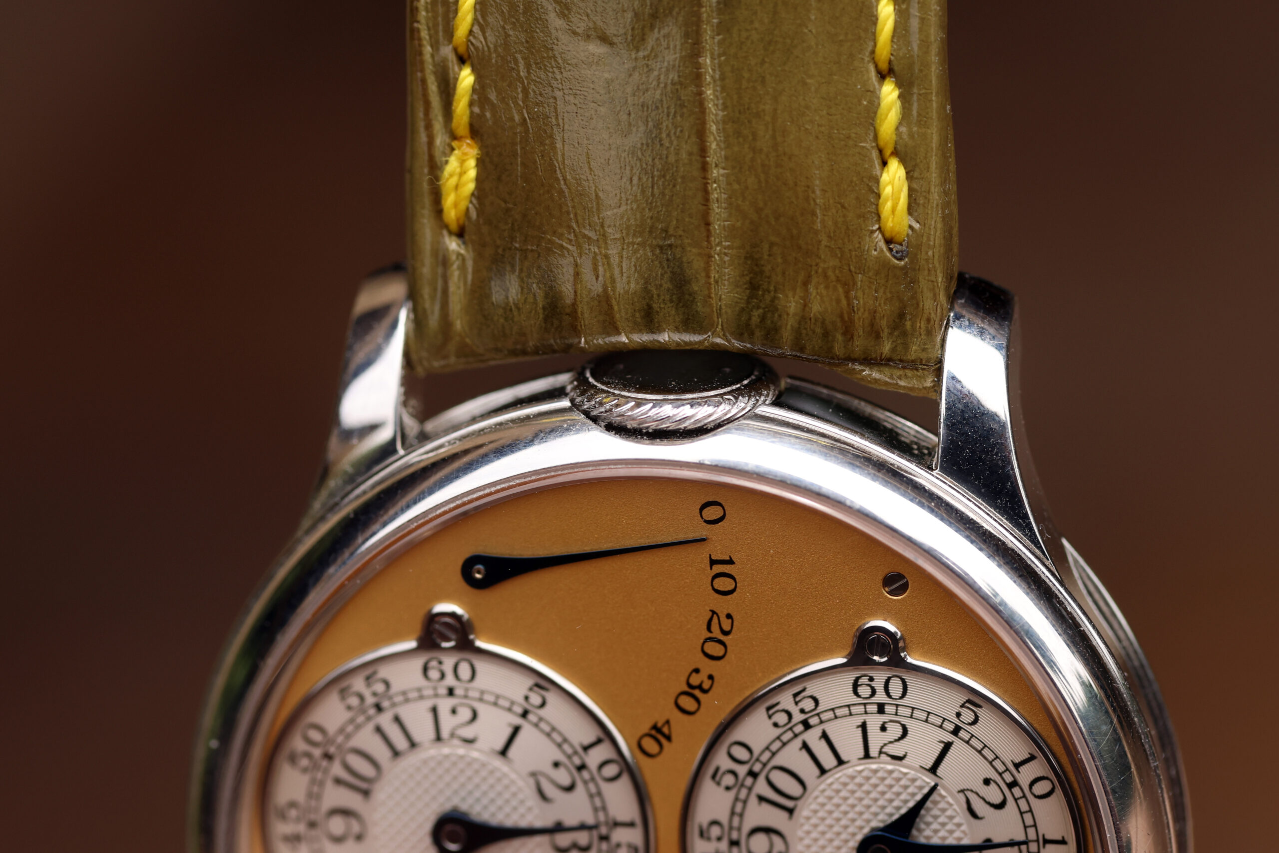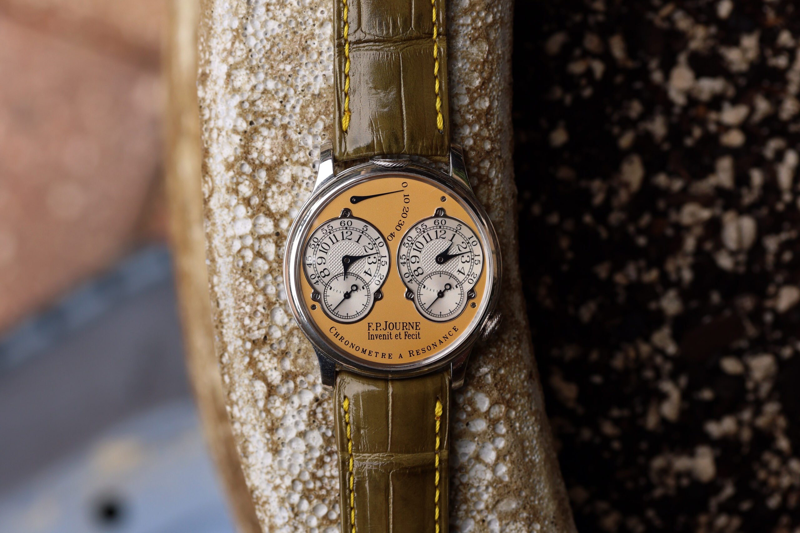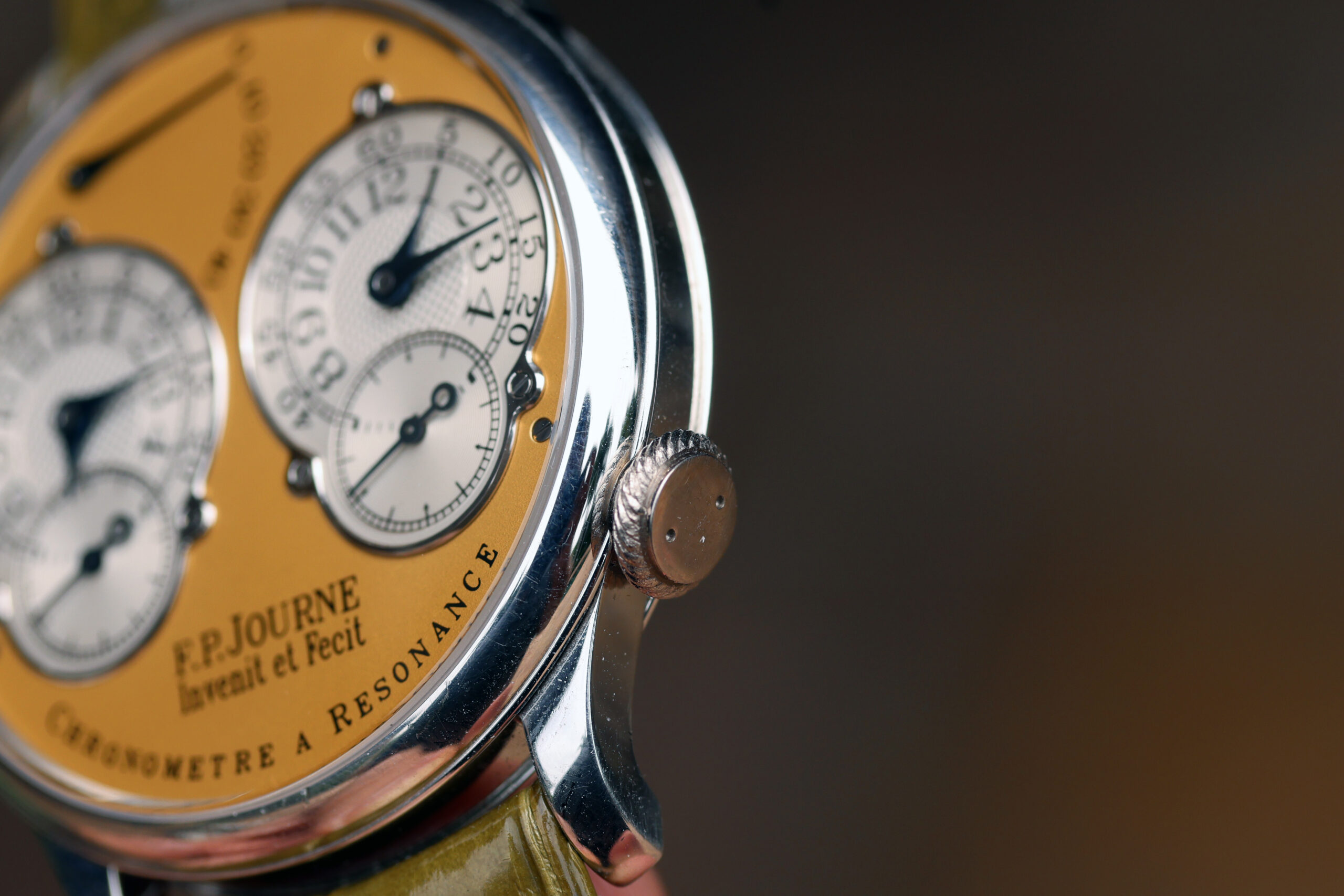 The platinum case with yellow gold dial spec on this watch is probably the most desirable. Yellow dials were only available on brass movement watches, along with white gold and pink gold variants. After the movements were switched over to rose gold ones, yellow dials were discontinued, making yellow dial Resonance some of the most rare and desirable.