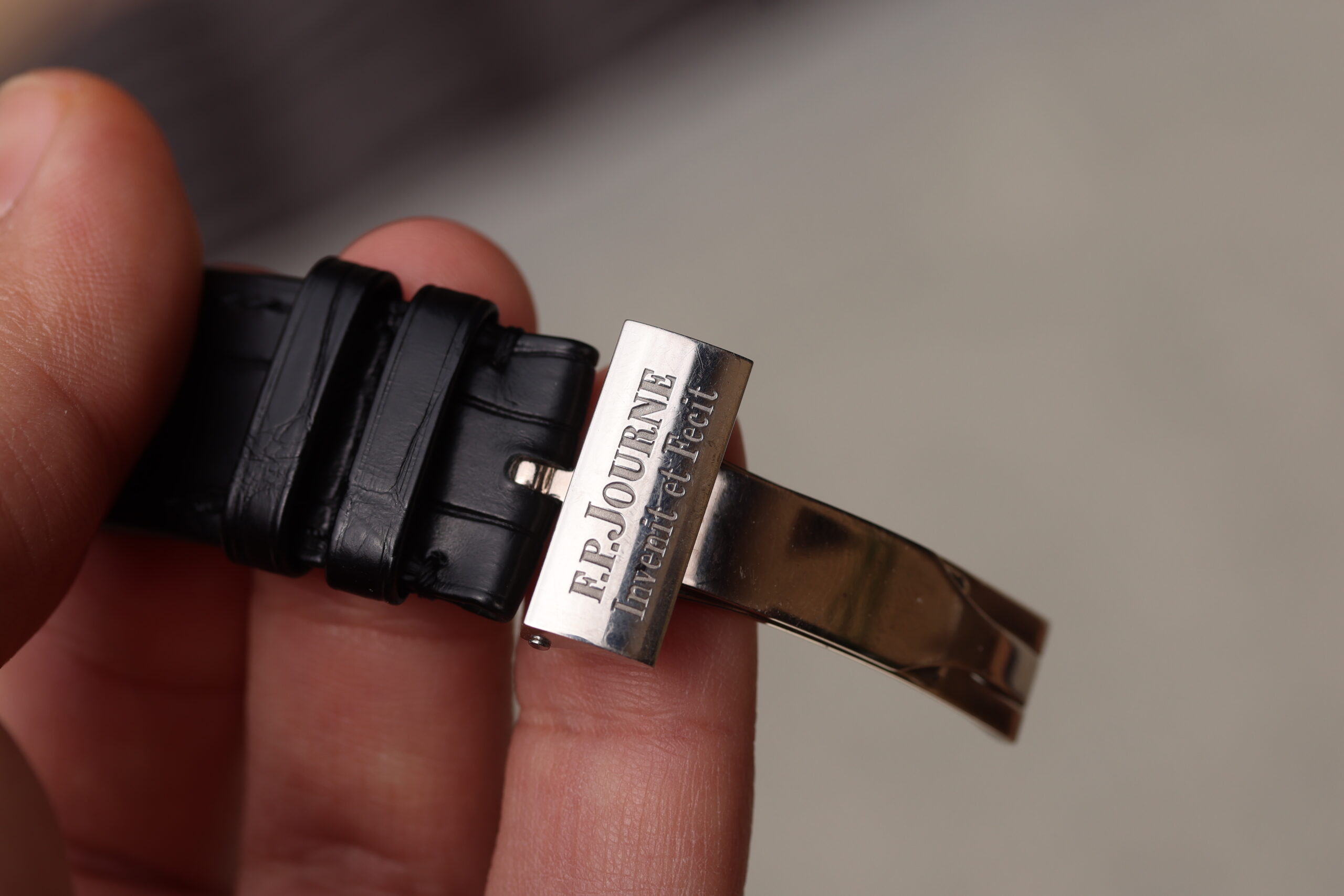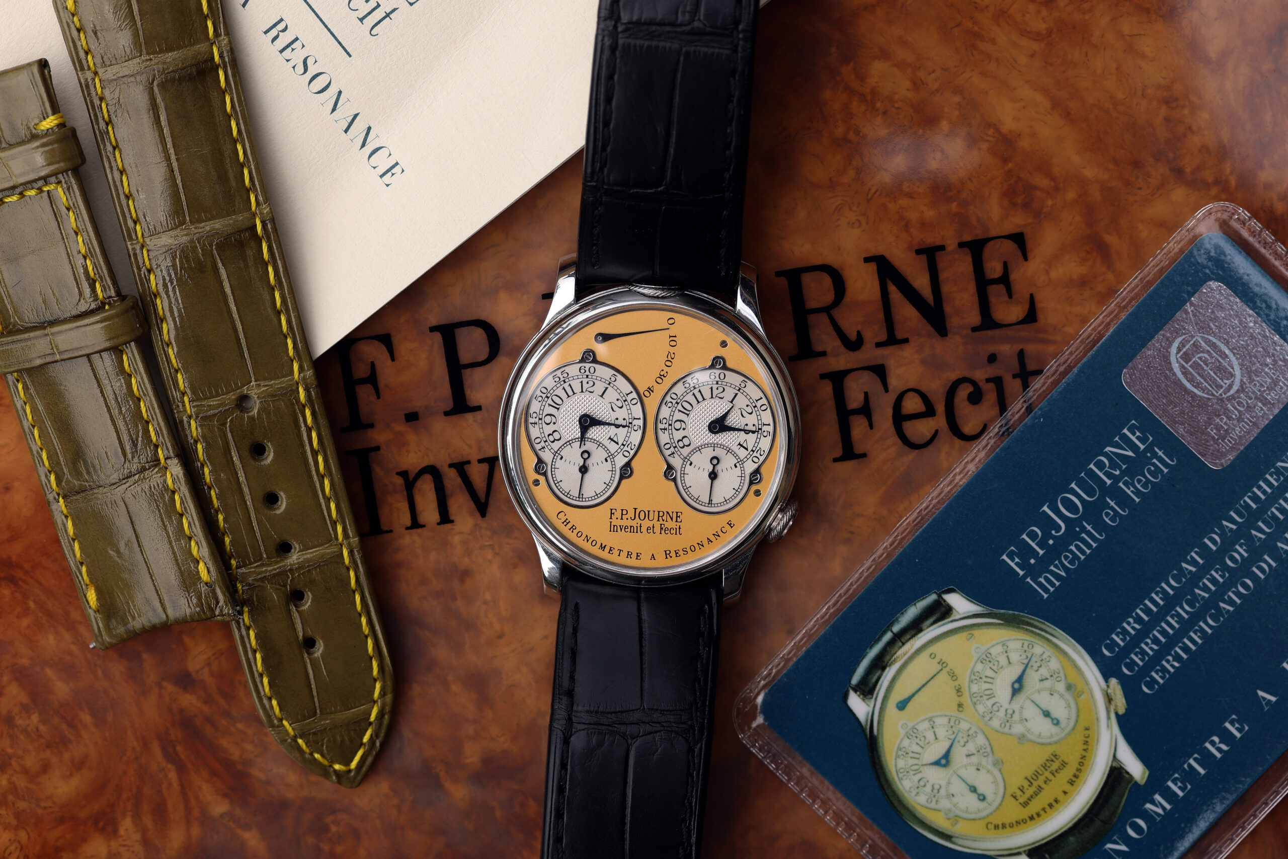 The watch comes with black FPJ strap, like new, mounted on factory FPJ deployment buckle. It also comes with a special order FPJ green strap with yellow stitching, unworn.