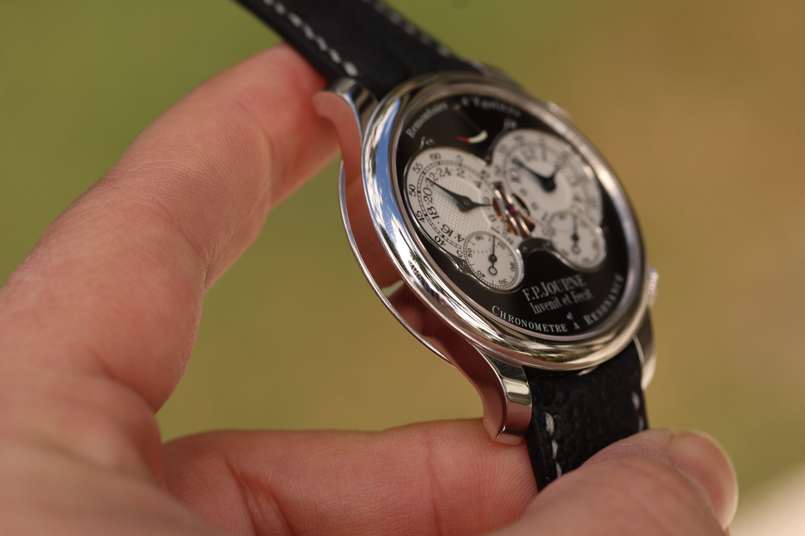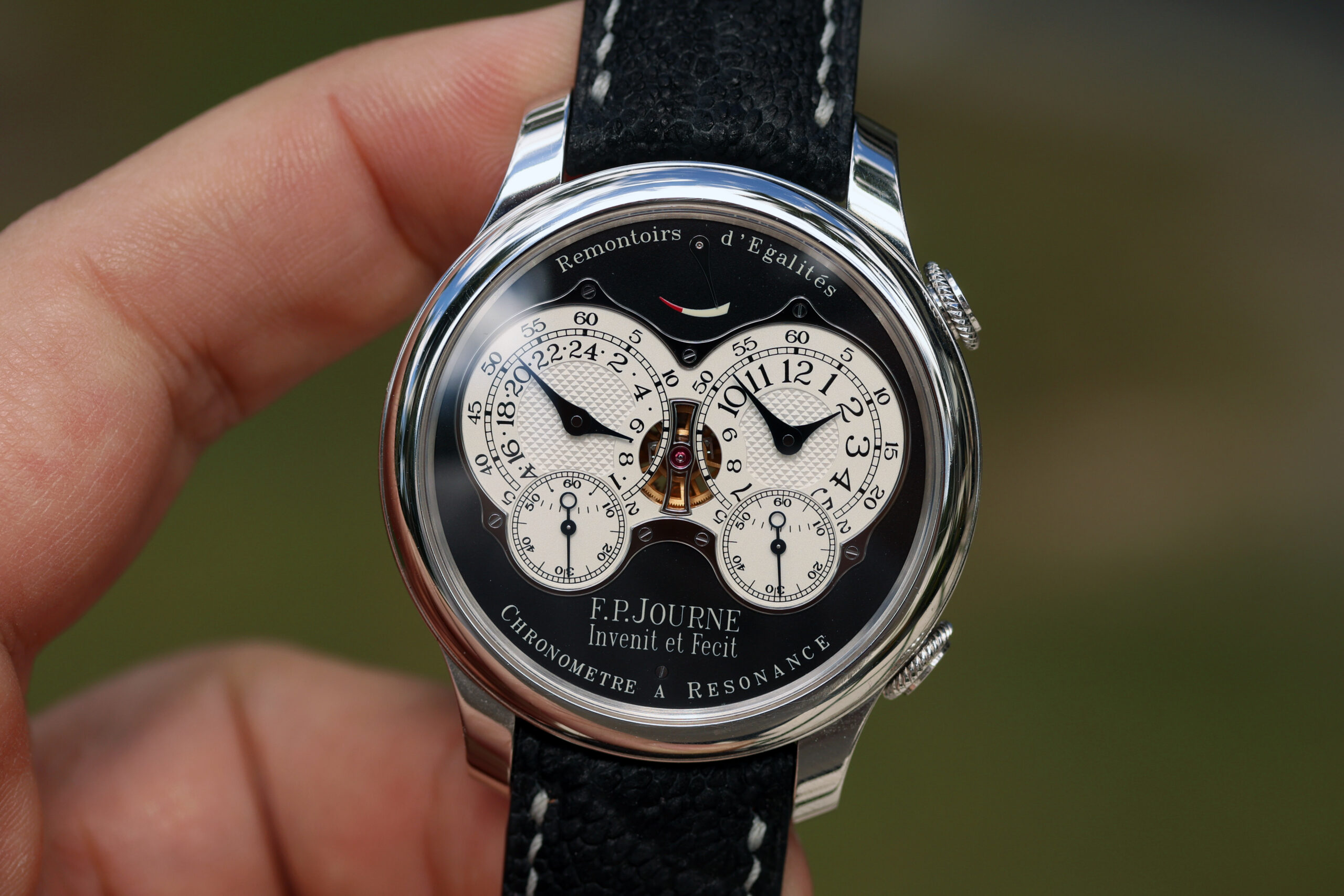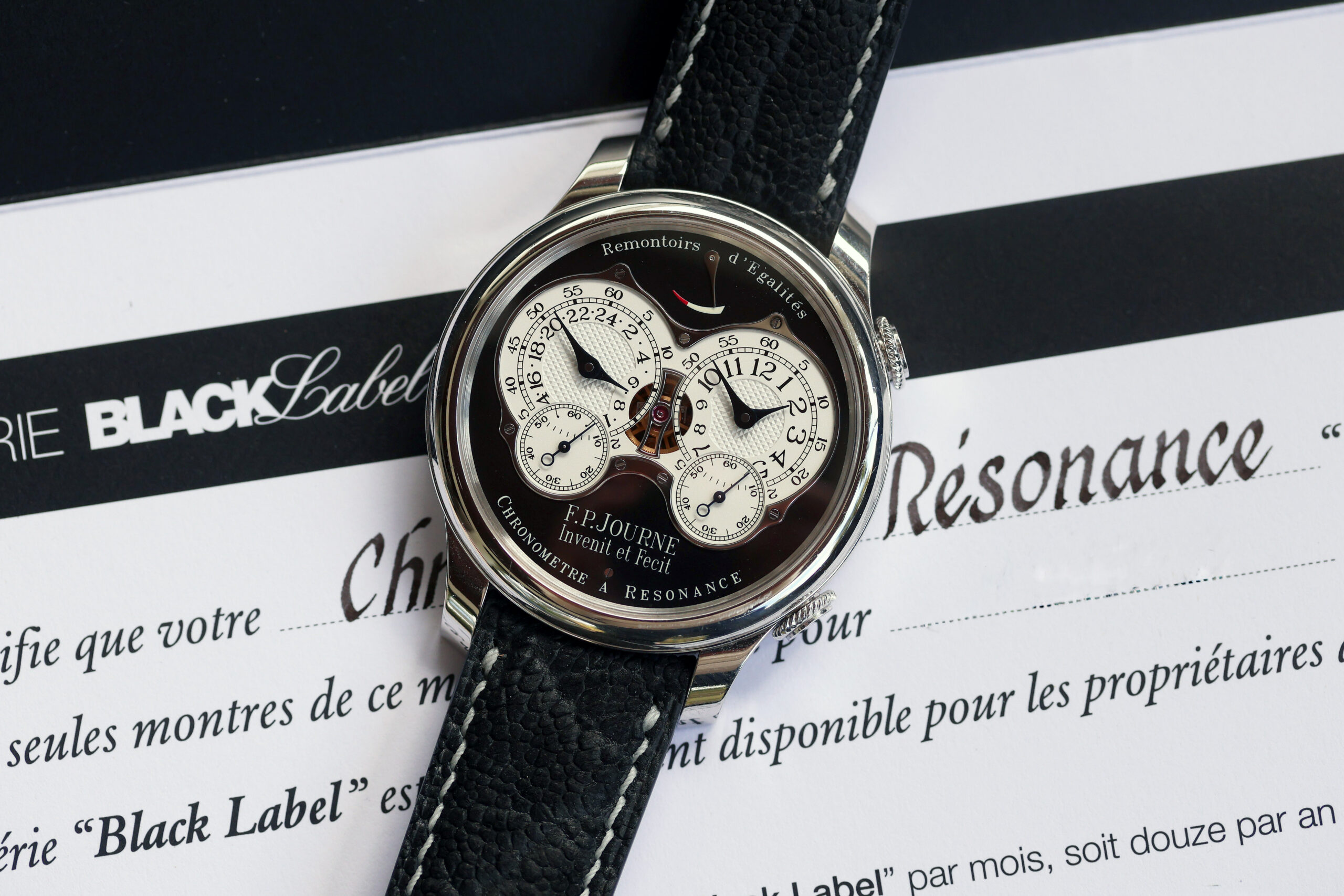 Up for grabs is an F.P. Journe Chronomètre à Résonance “RQ” (Résonance Quatre) Black Label in platinum.