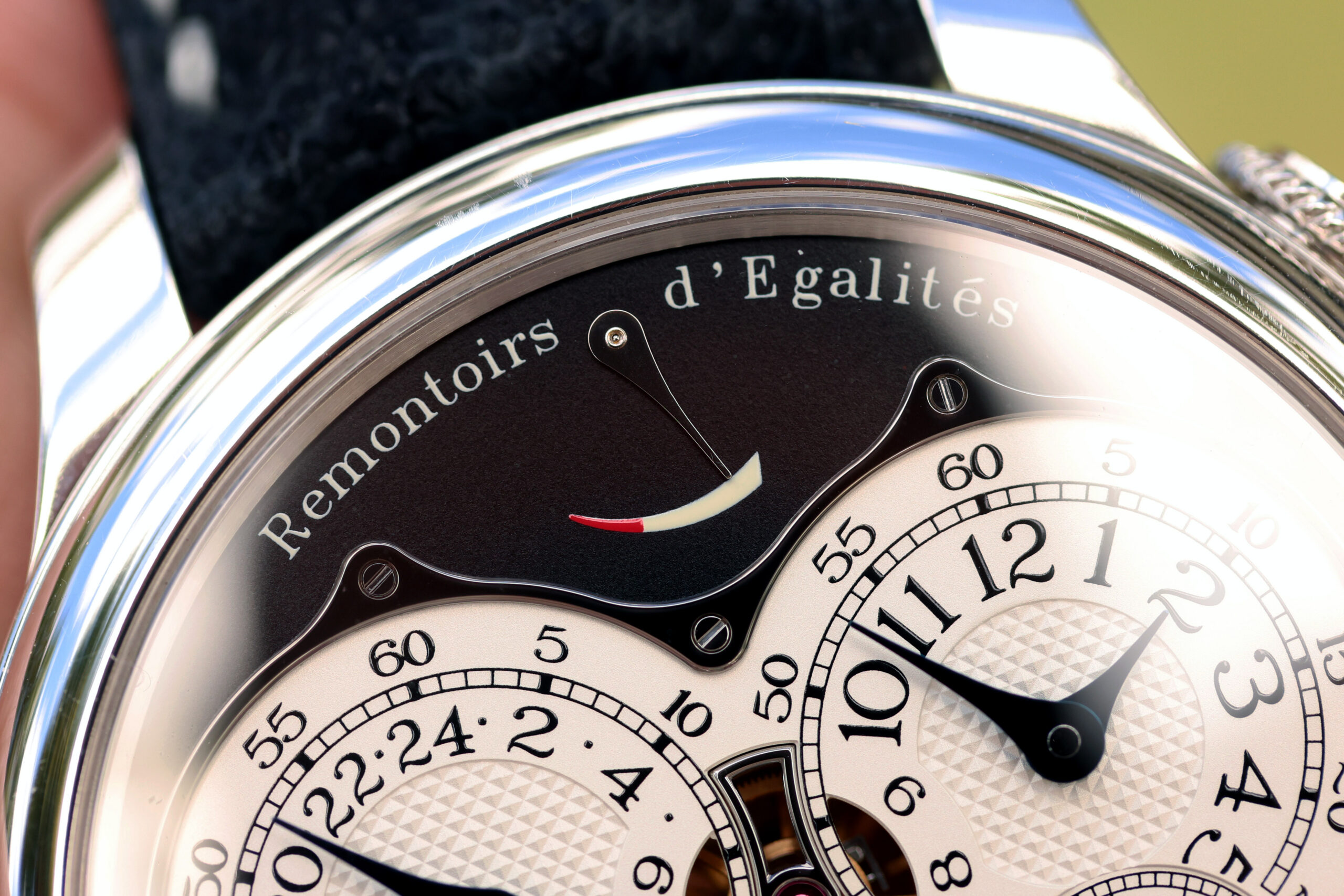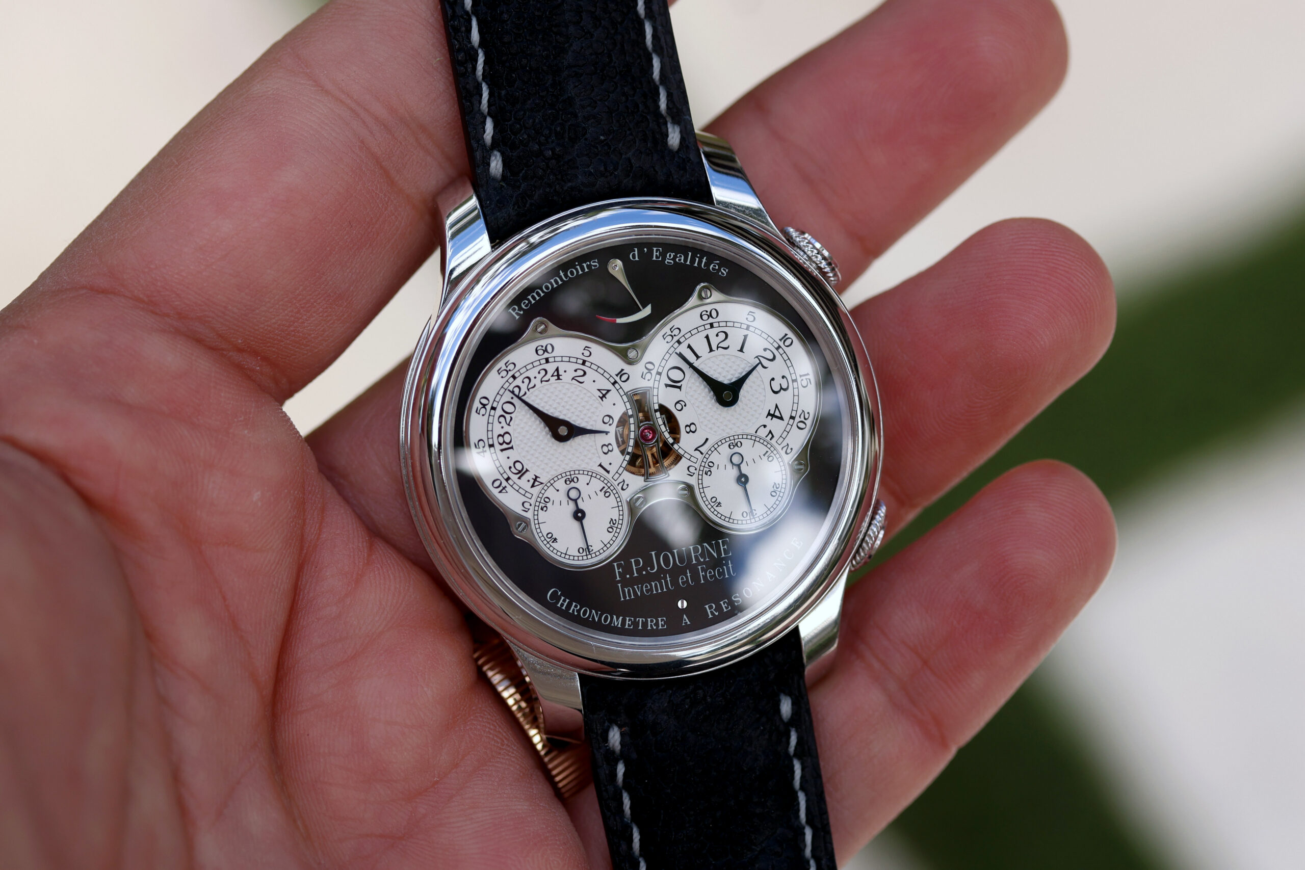 It is fitted on a factory black suede F.P. Journe strap with white stitching in excellent condition, paired with a factory platinum F.P. Journe buckle.