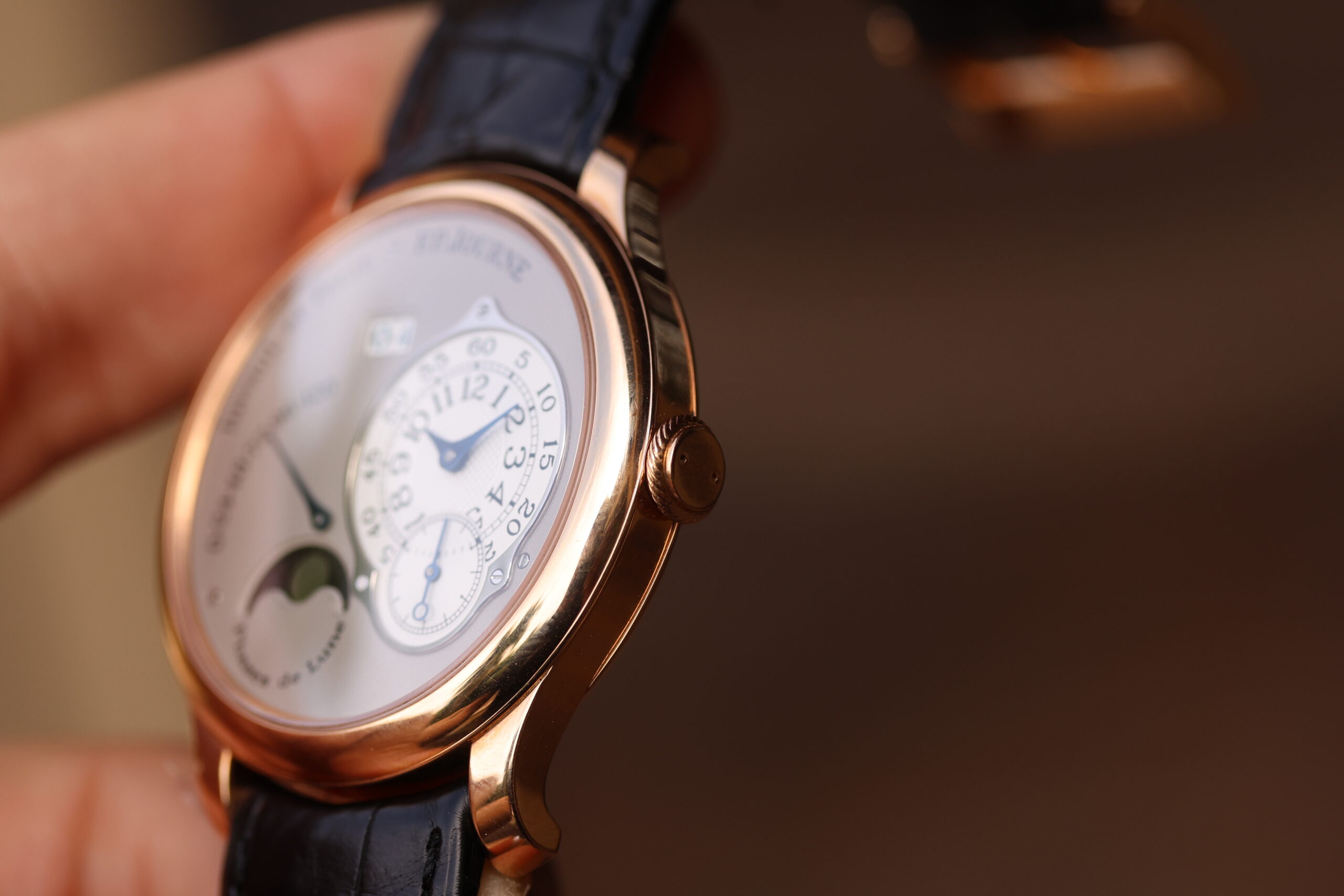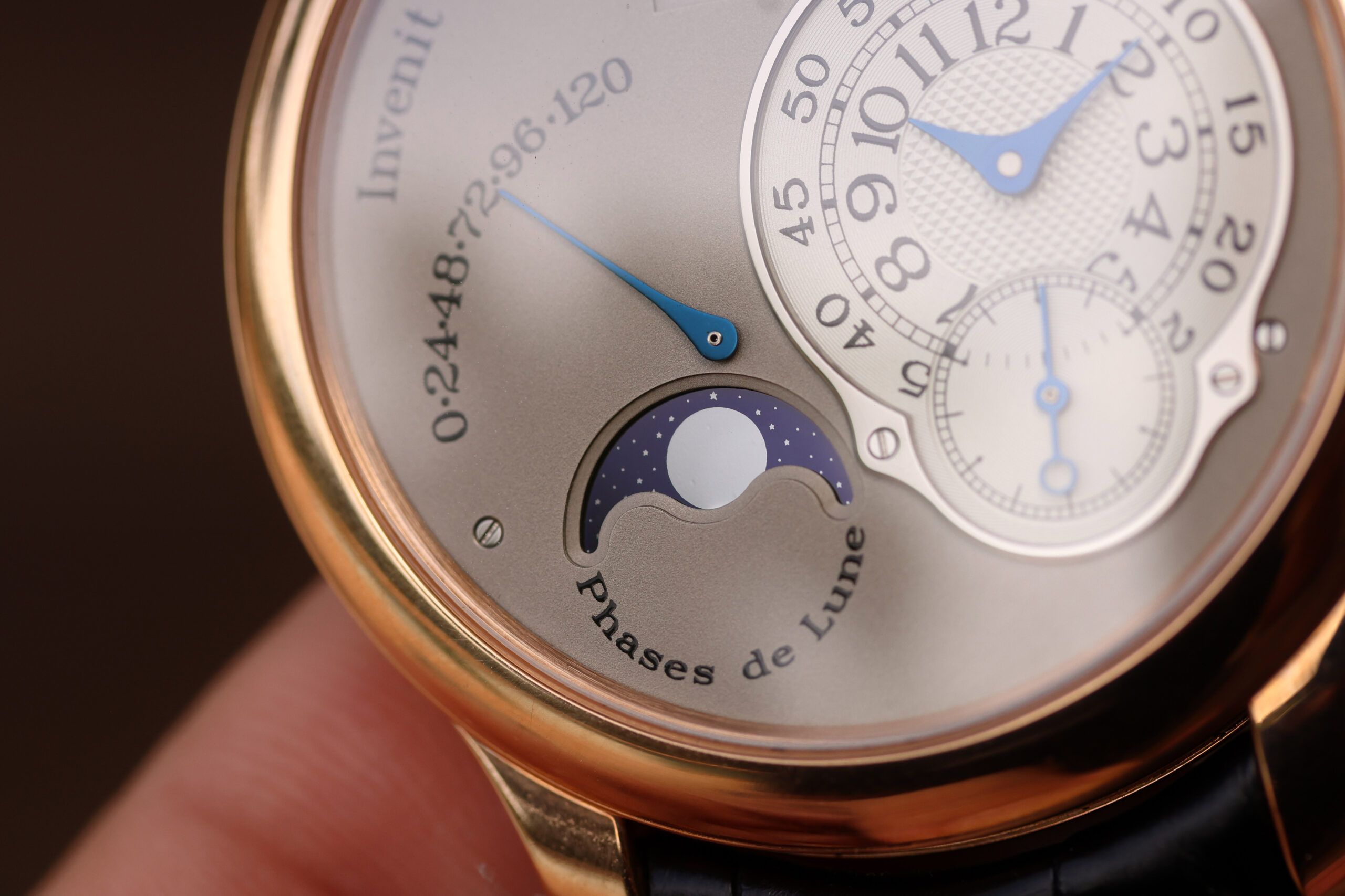This watch is in classic configuration with 40mm red gold case and white gold (grey) dial. Rose gold movement.