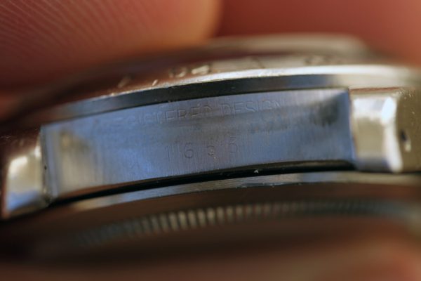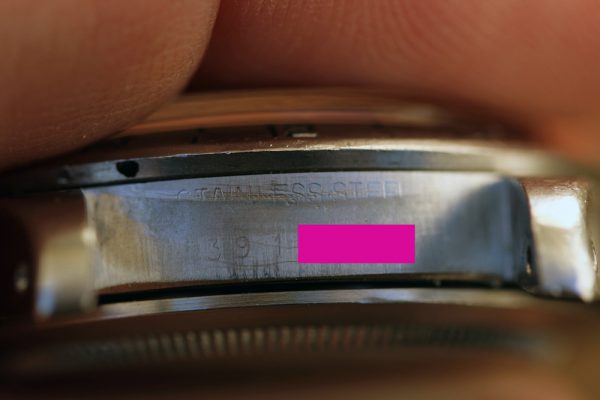 Excellent vintage condition case appears to be in unmolested condition. The case shows wear, but also shows original bevels on thick lugs and crown guards. No corrosion or pitting. Serial and reference numbers are fully intact and clearly visible.