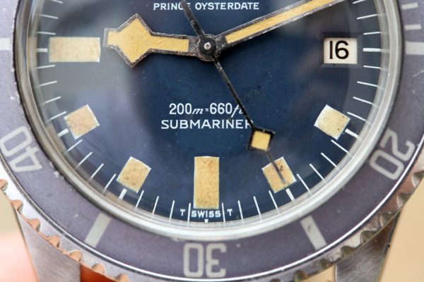 Dial is original, blue with very attractive yellow patina. Some aging and spotting, but no chipping or bubbling. Hands are original Tudor, have been relumed to match the dial with non-luminous material.