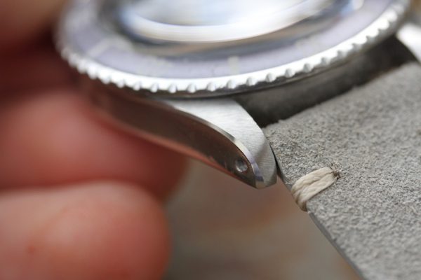 Watch comes on unworn vintage gray leather strap with steel generic buckle.