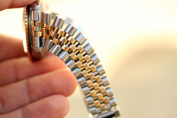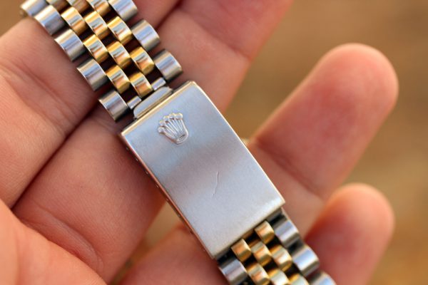 Bracelet is a 62523H-14 in steel and 14kt yellow gold. Shows lots of stretch from use. Age matching date coded C and 450 end’s.