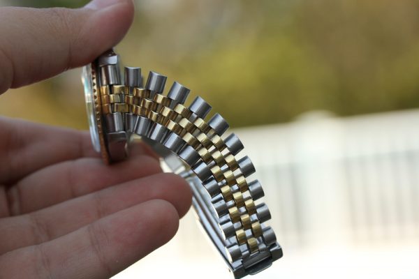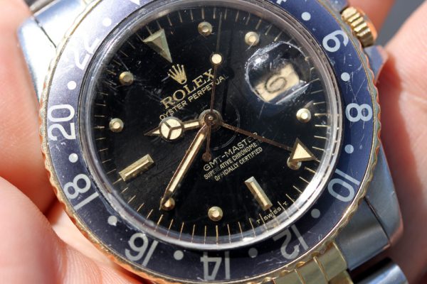 Very good “nipple” Root Beer dial. Creamy patina on markers with matching hands. Please note a drag mark at base of hands. Date disk is correct with open 6’s and 9’s. Any other marks you see in pictures are on the crystal.