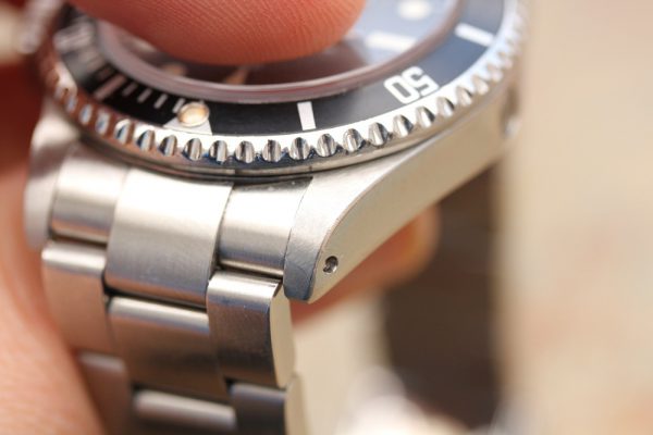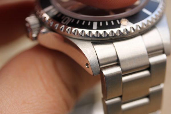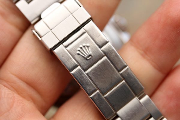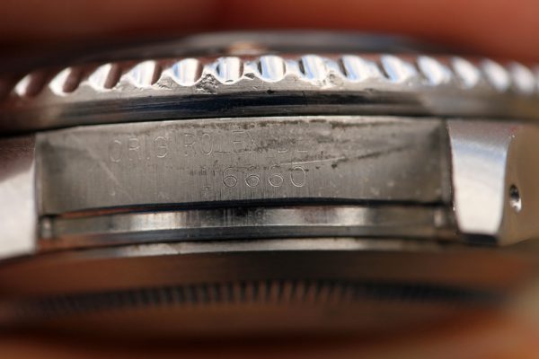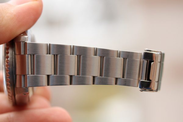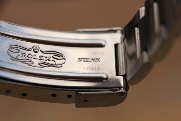 Bracelet is a Rolex 93160A in excellent condition, tight, 12 links total, SEL, diver’s extension. Date code is DT10 on clasp. Crisp coronet on outer clasp.