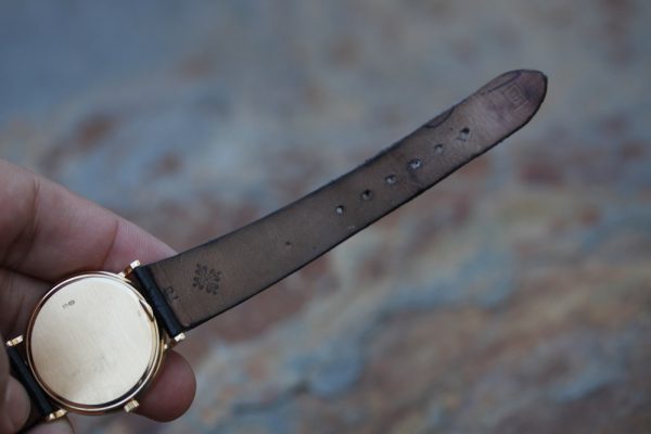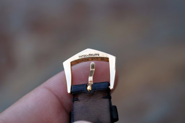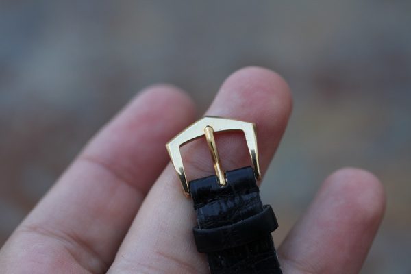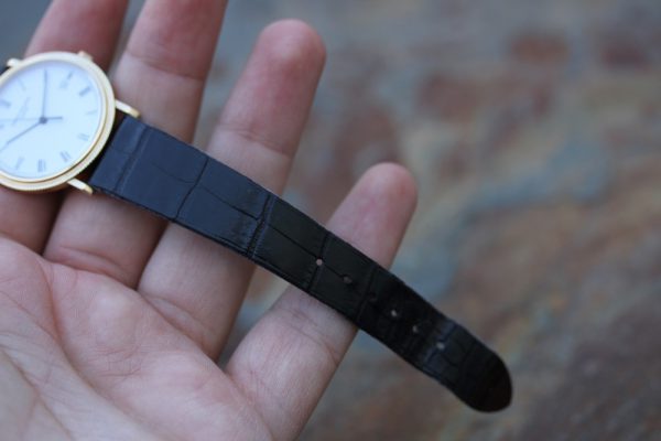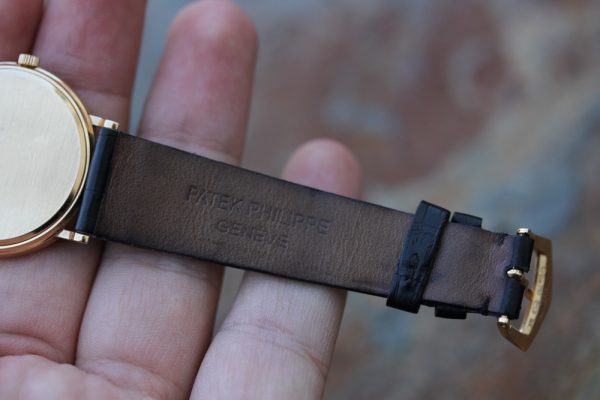 Black alligator Patek strap is in good condition. Shows signs of being used, but no tears or cracks. Original and signed 18kt yellow Patek buckle.