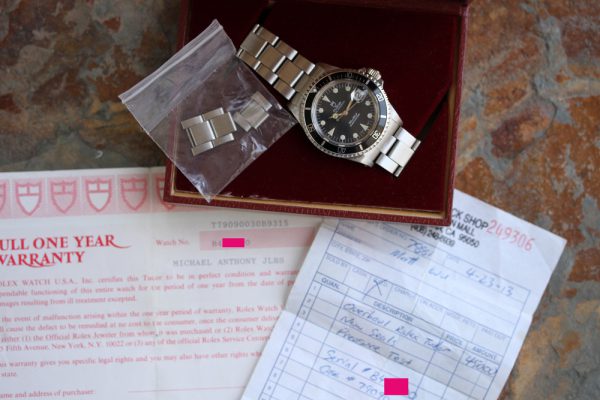 Watch comes with original box, warranty papers, and service receipt from 2013.